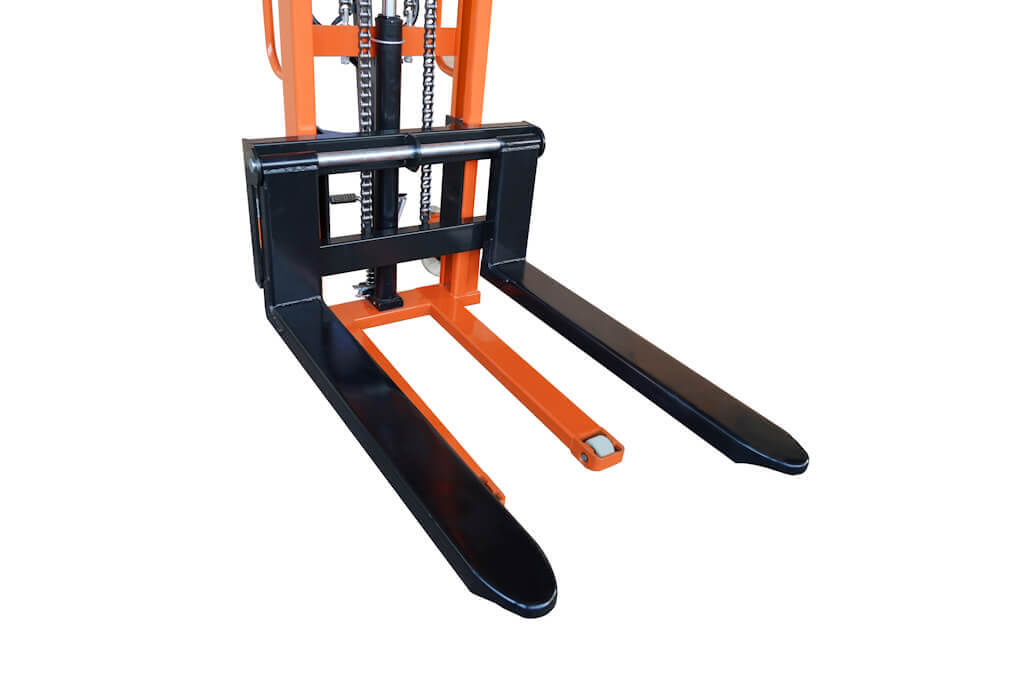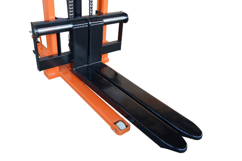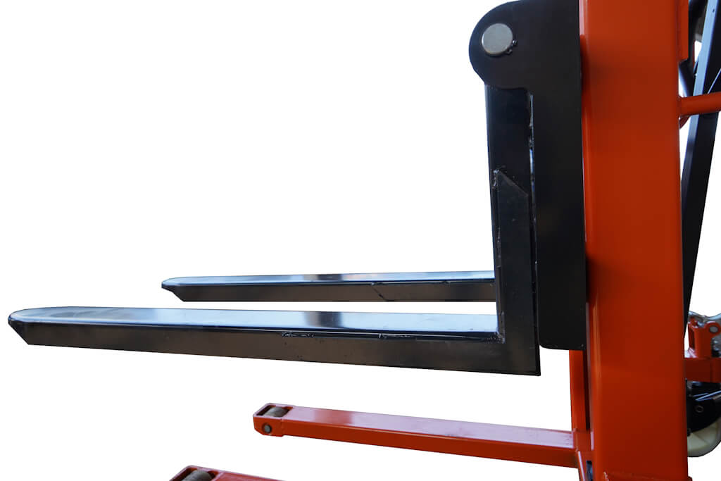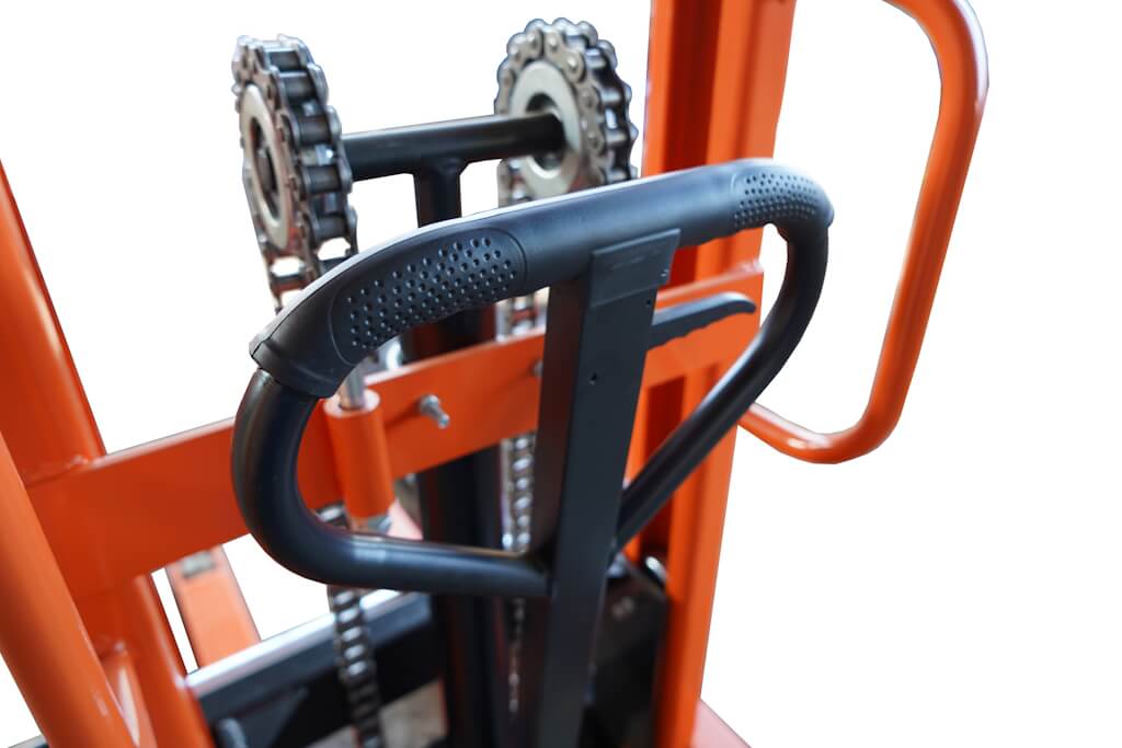Вилы поднимаются за счет цепной передачи и мощного гидравлического цилиндра, которые приводятся в движение ручным рычагом с рукояткой переключения режимов или складной ножной педалью.