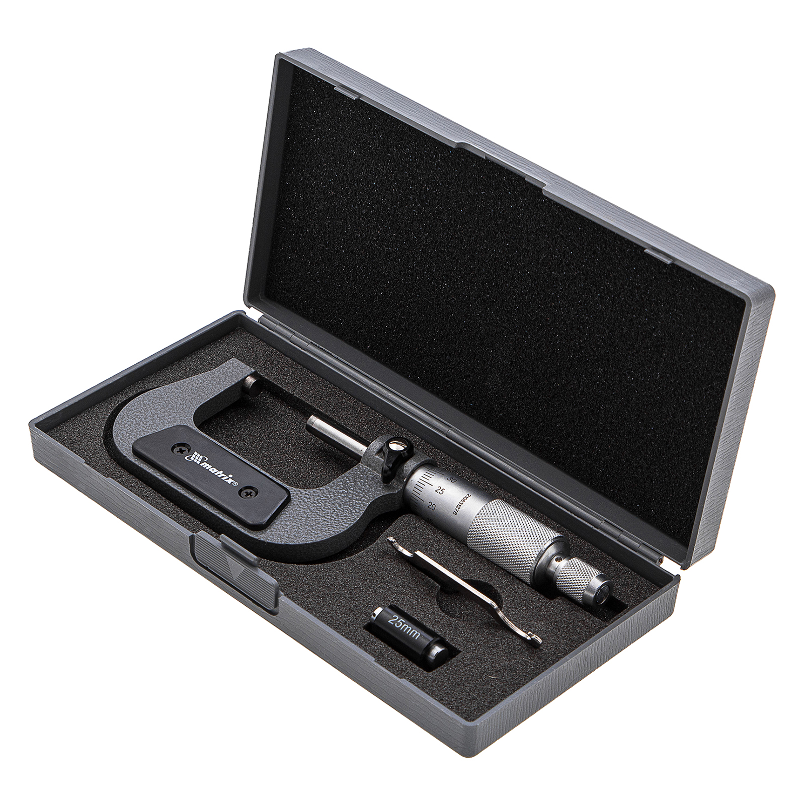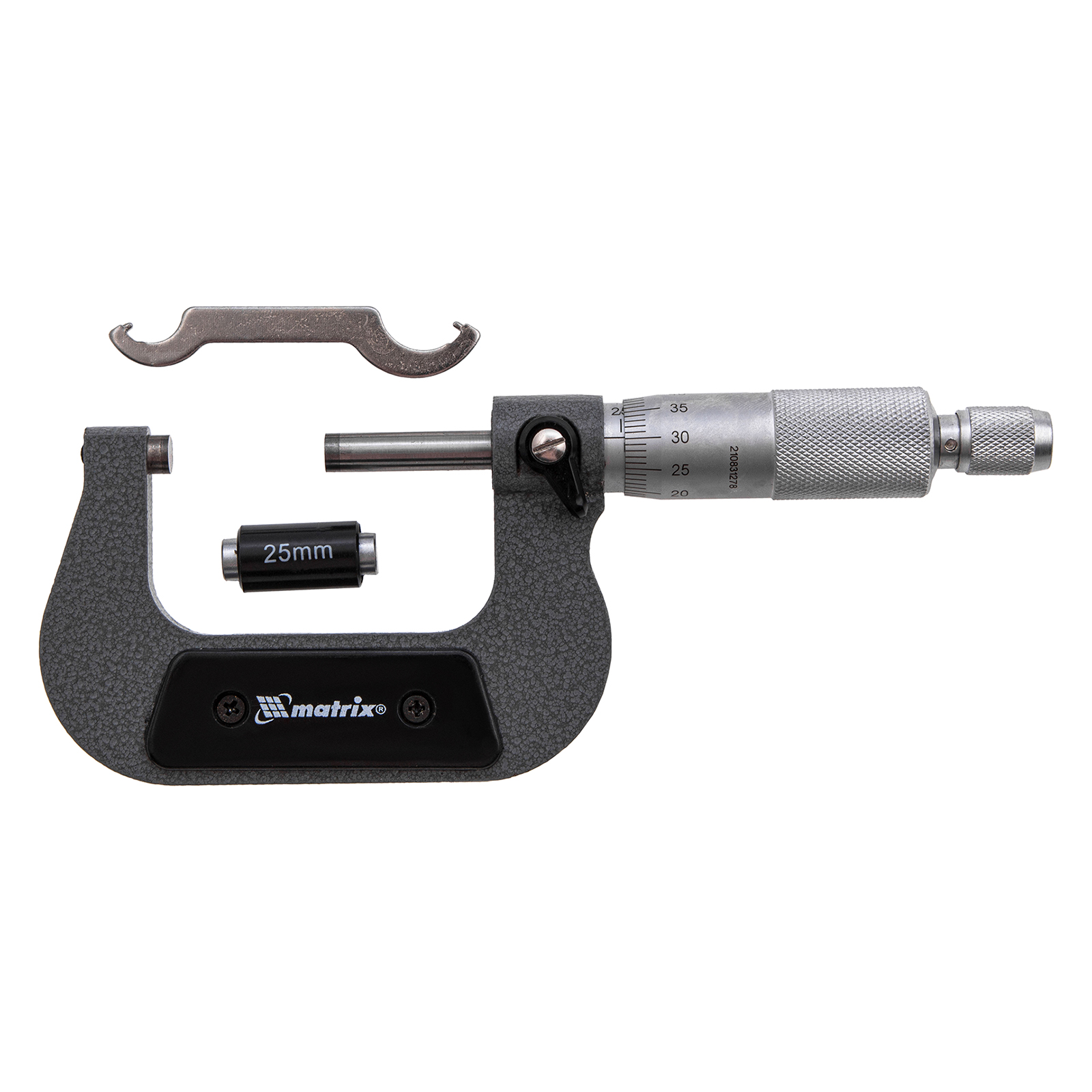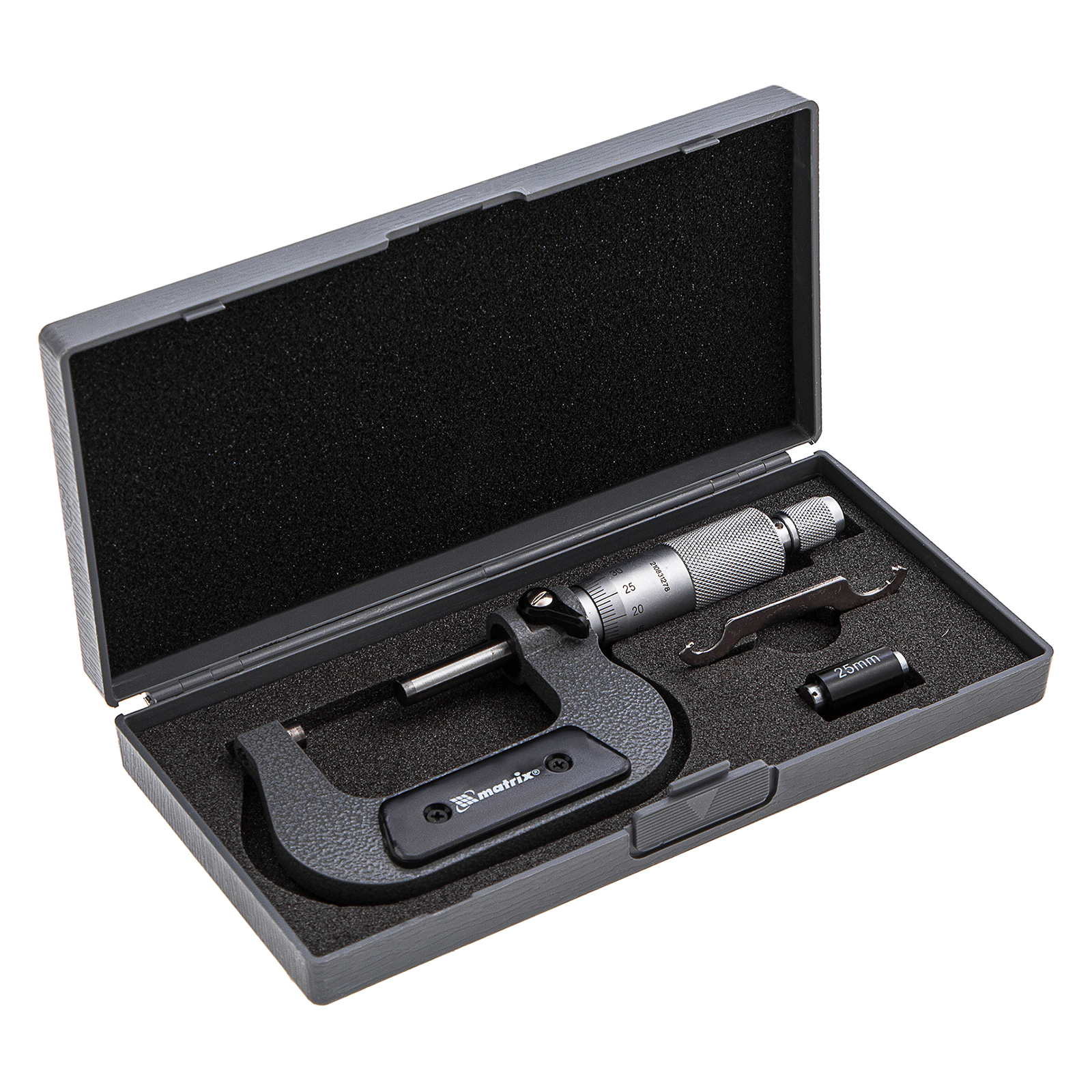 Микрометр механический Matrix 317505 используется для измерения толщины листового металла и деталей размером 25-50 мм. Обеспечивает высокую точность результатов — шаг измерения составляет 0,01 мм с допустимой погрешностью ±0,004 мм. Комплектуется установочной мерой, позволяющей при необходимости произвести настройку прибора. Микрометр будет полезен на производстве, в слесарной мастерской и автосервисе.