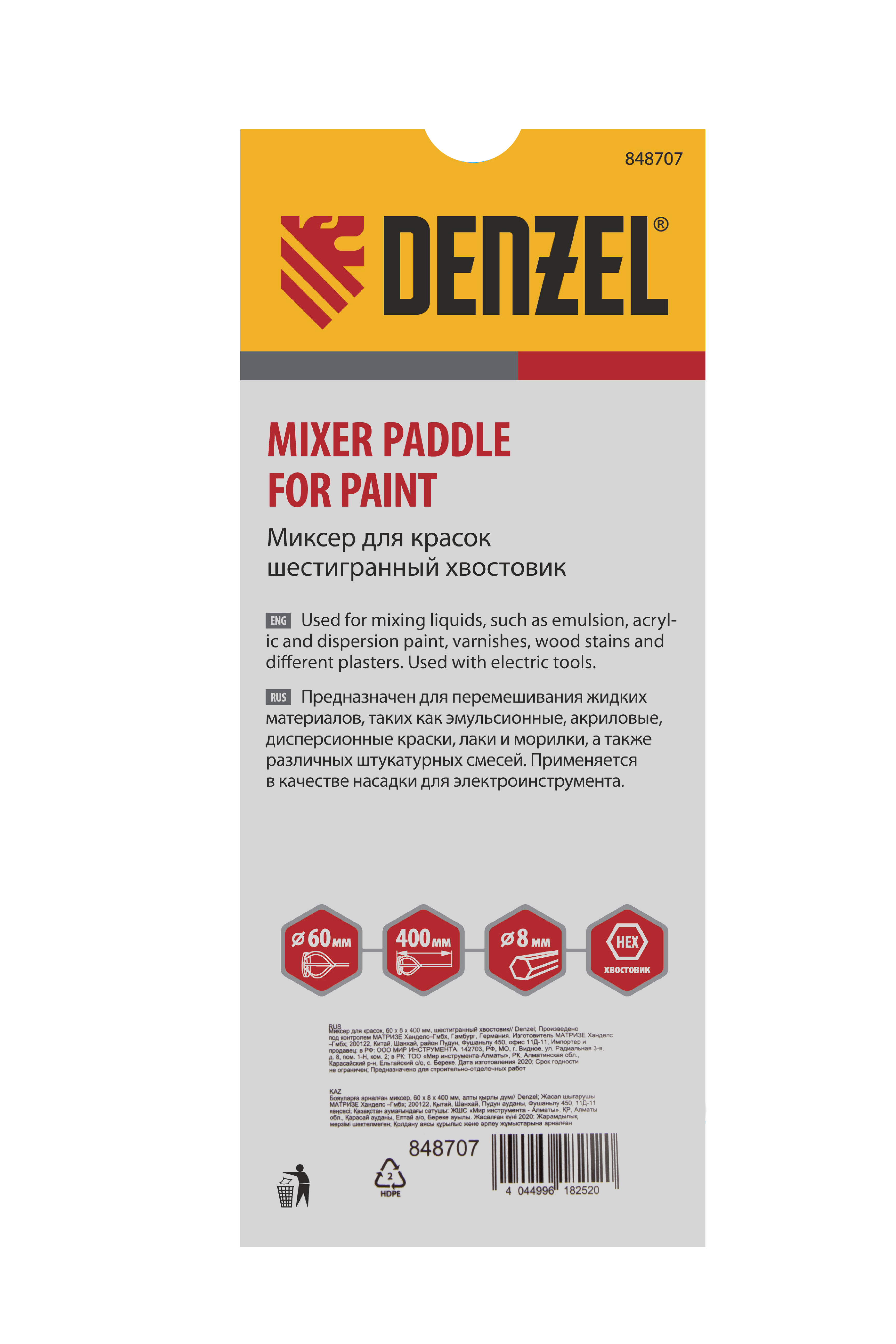Миксер для красок, 60 х 8 х 400 мм, шестигранный хвостовик Denzel