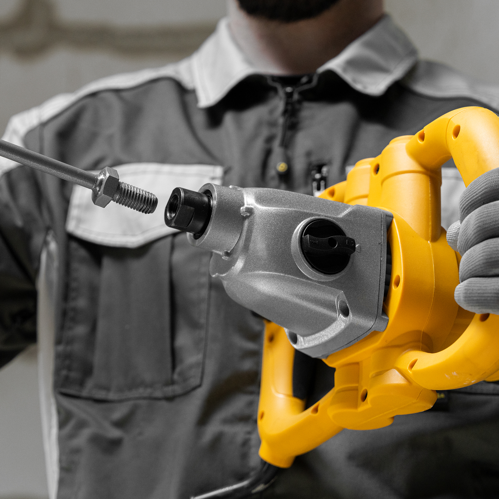 - Прочная сварная конструкция — стальной миксер выдерживает значительные нагрузки при размешивании густых составов.