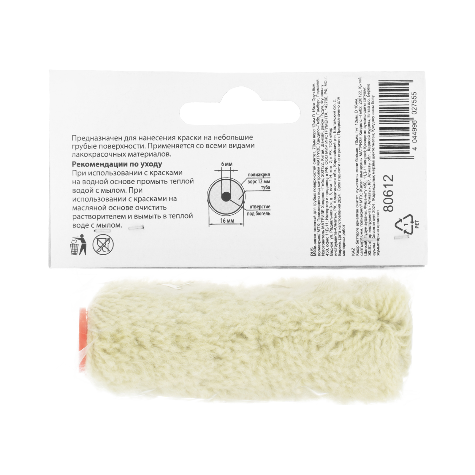 Мини-валик сменный для грубых поверхностей синтетический, 60 мм, ворс 12 мм, D 16 мм, D ручки 6 мм, полиакрил MTX