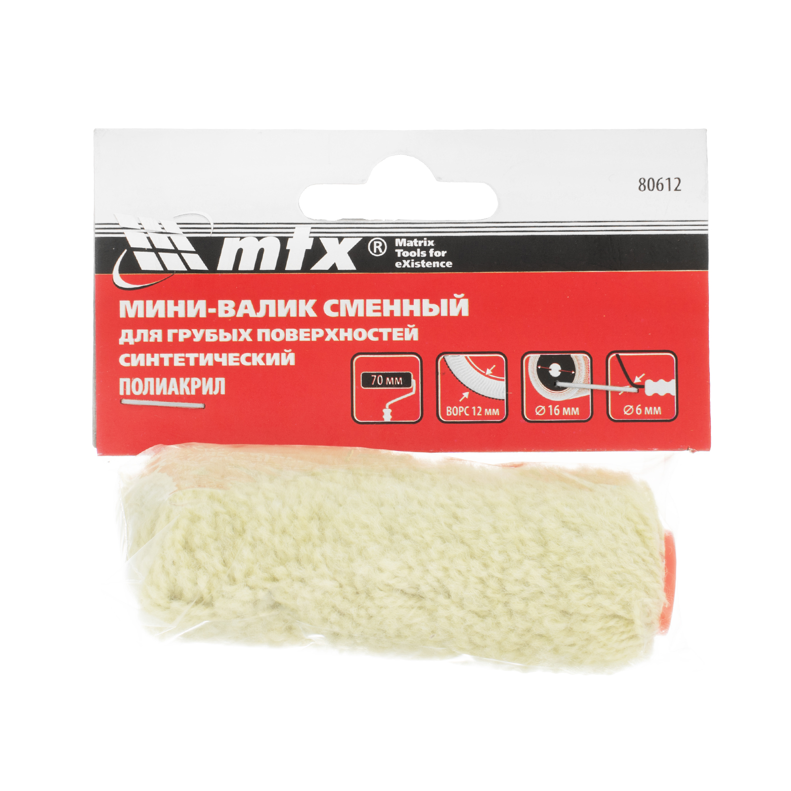 Сменный синтетический мини-валик для грубых поверхностей MTX 80612 шириной 70 мм, диаметром ролика 16 мм, с шубкой из полиакрила 12 мм, подходит для бюгелей диаметром 6 мм. Используется для нанесения красок на водной основе или красок с ограниченным содержанием растворителей. Имеет длительный срок службы, оптимален для полушершавых поверхностей, но подходит также для гладких и грубых оснований.