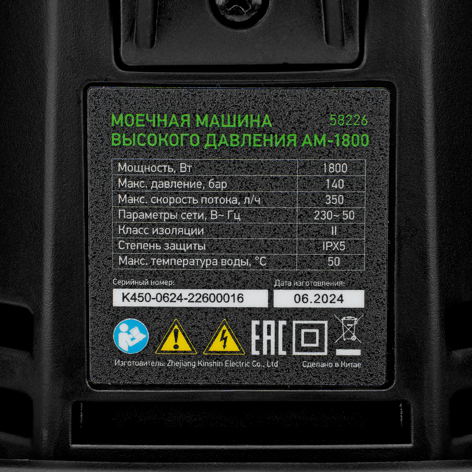 Моечная машина высокого давления АМ-1800, 1800 Вт, 140 бар, 350 л/ч, колесная Сибртех