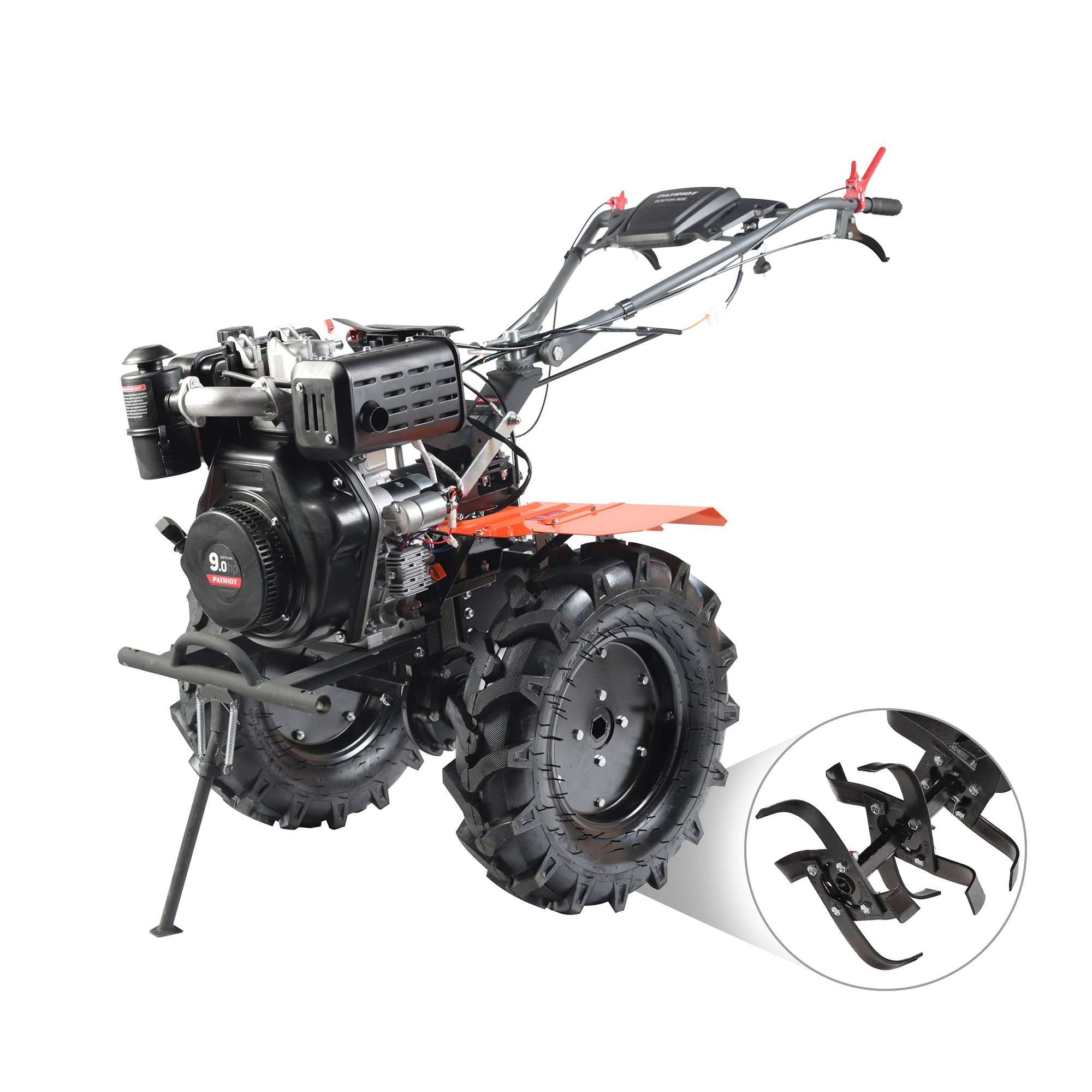 Мотоблок совместим с различной навеской благодаря универсальному прицепному узлу и валу отбора мощности (ВОМ), что расширяет его функционал. Доступны два вида старта: ручной и электро, с аккумулятором 12В для легкого запуска.