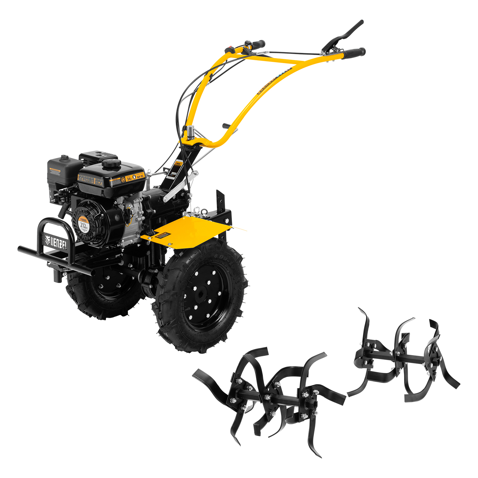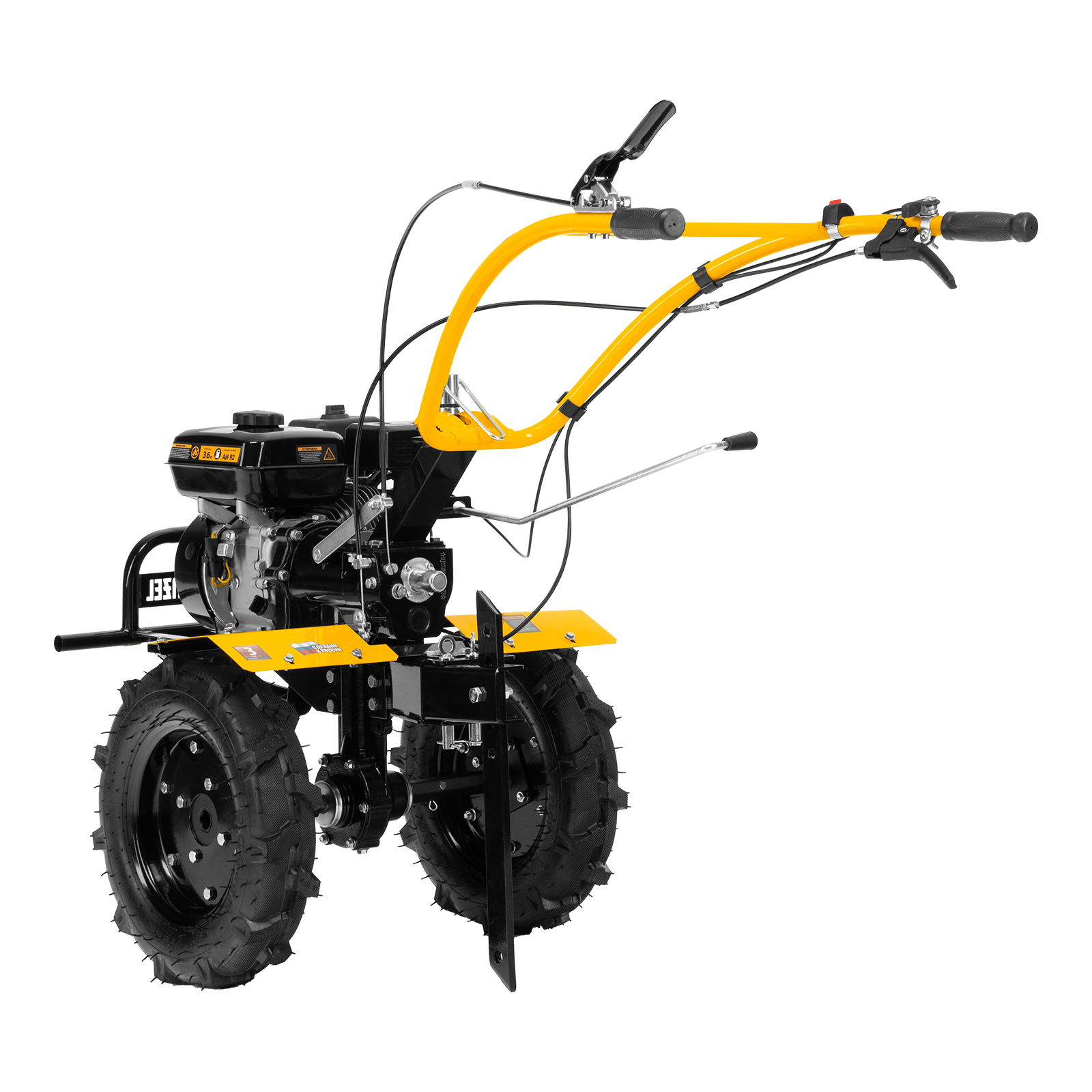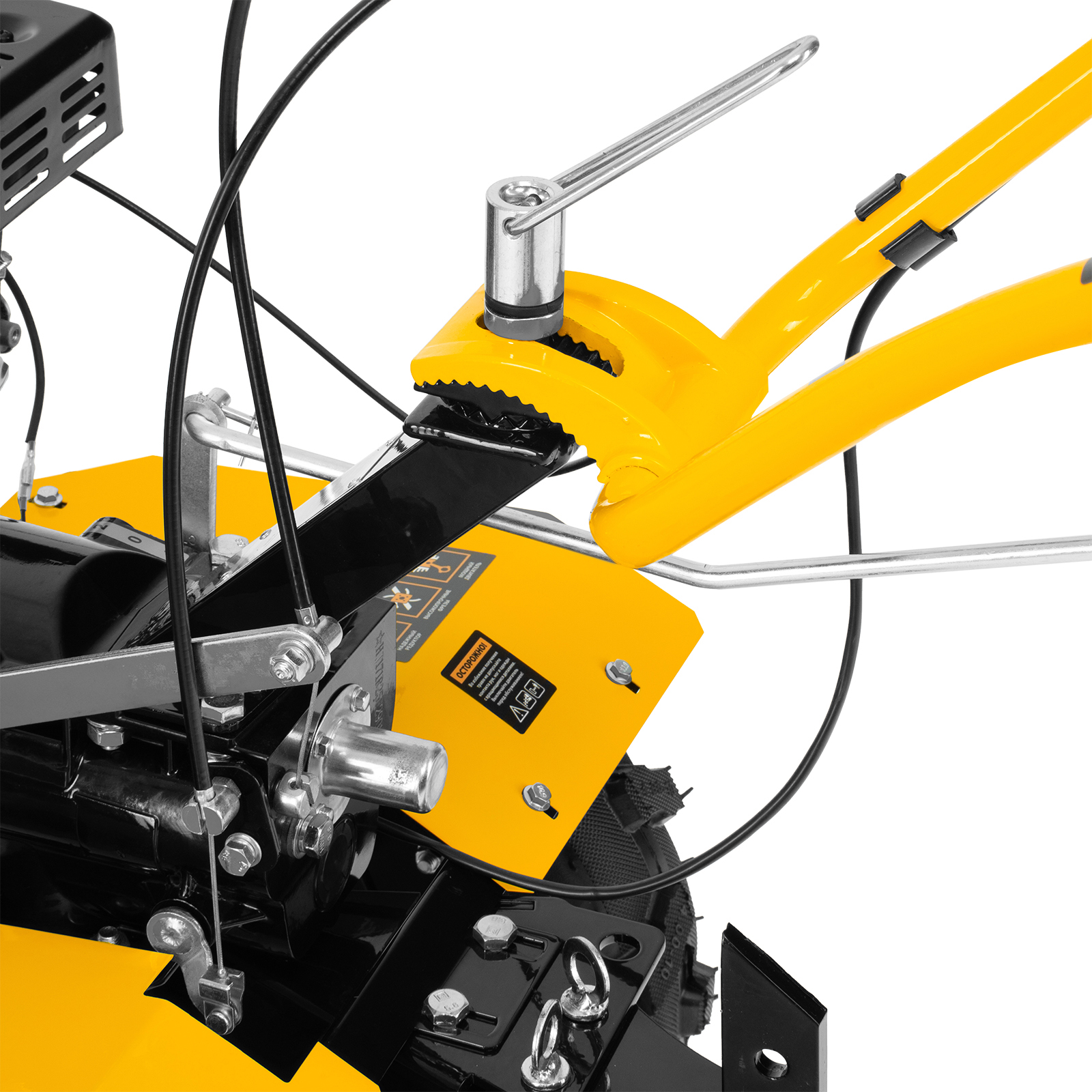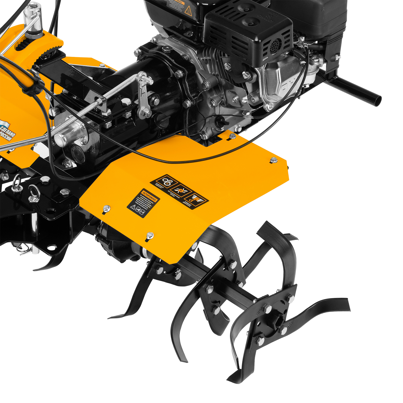 - Комфортное управление — регулятор оборотов двигателя и кнопка пуска выведены на рукоятку перед оператором, поэтому можно оперативно менять режим вспашки, не наклоняясь.