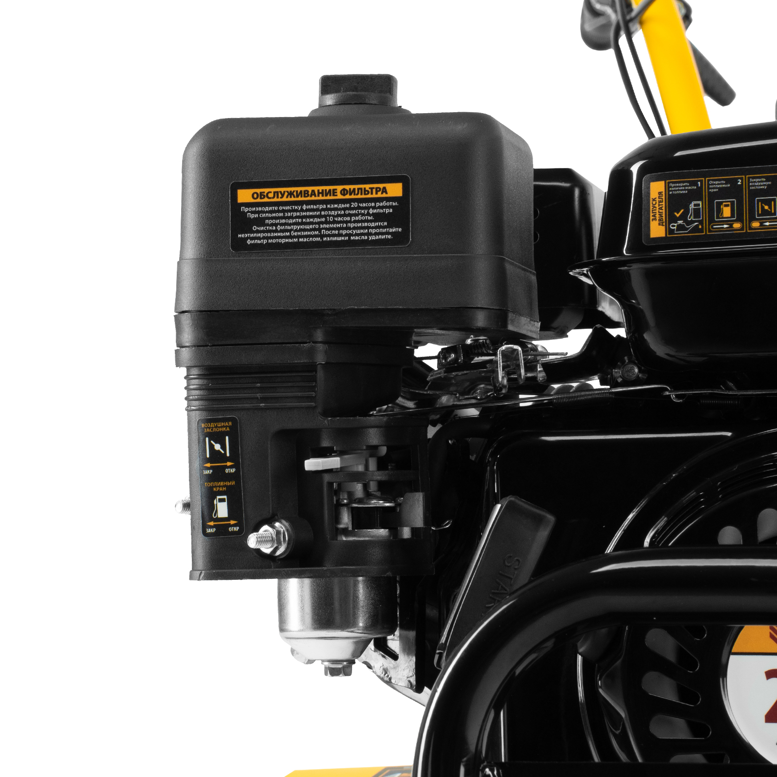 - Легкая заправка — широкая заливная горловина сокращает время заполнения топливного бака и предотвращает разбрызгивание бензина.