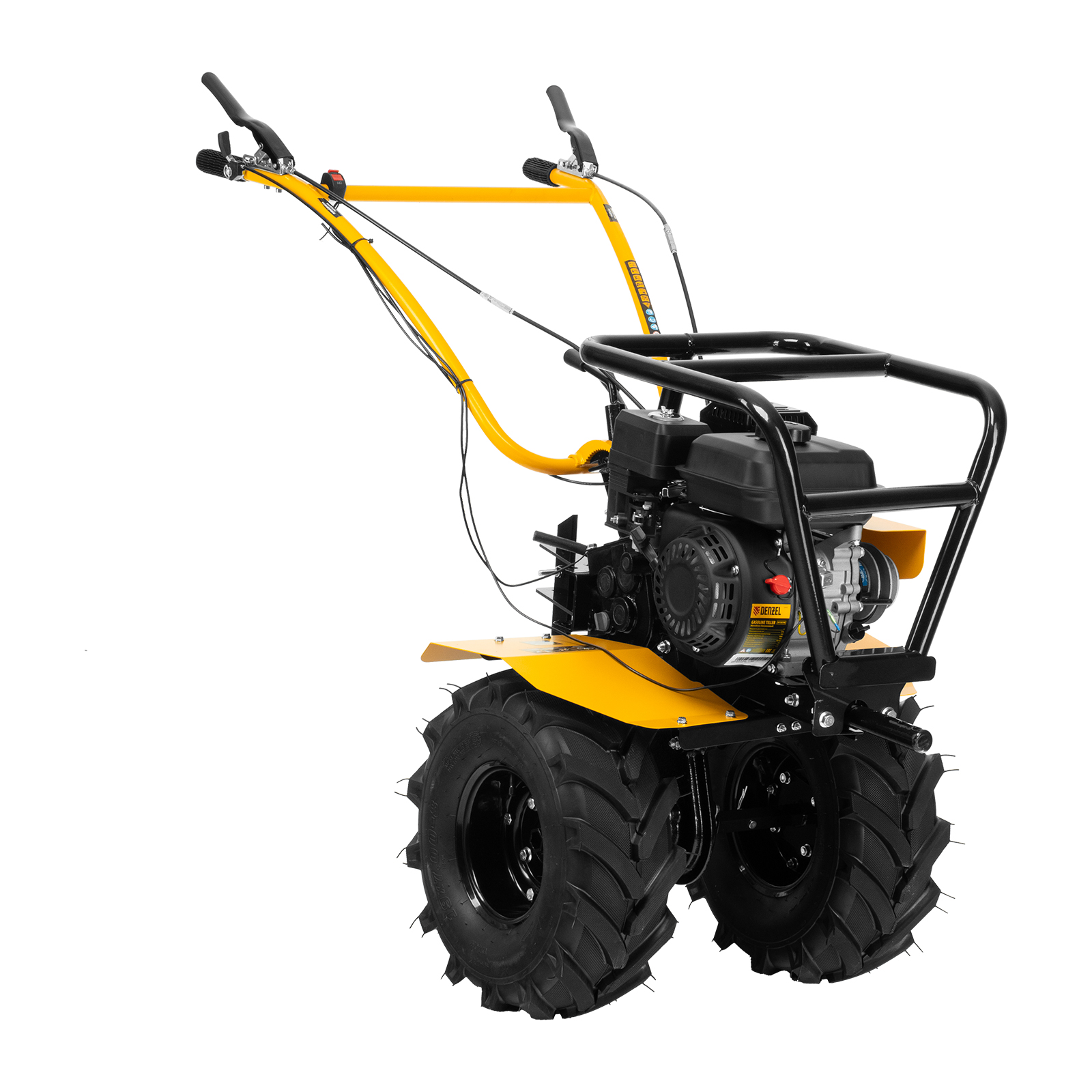 - Повышенная проходимость — мотоблок оснащен тракторными пневматическими колесами.