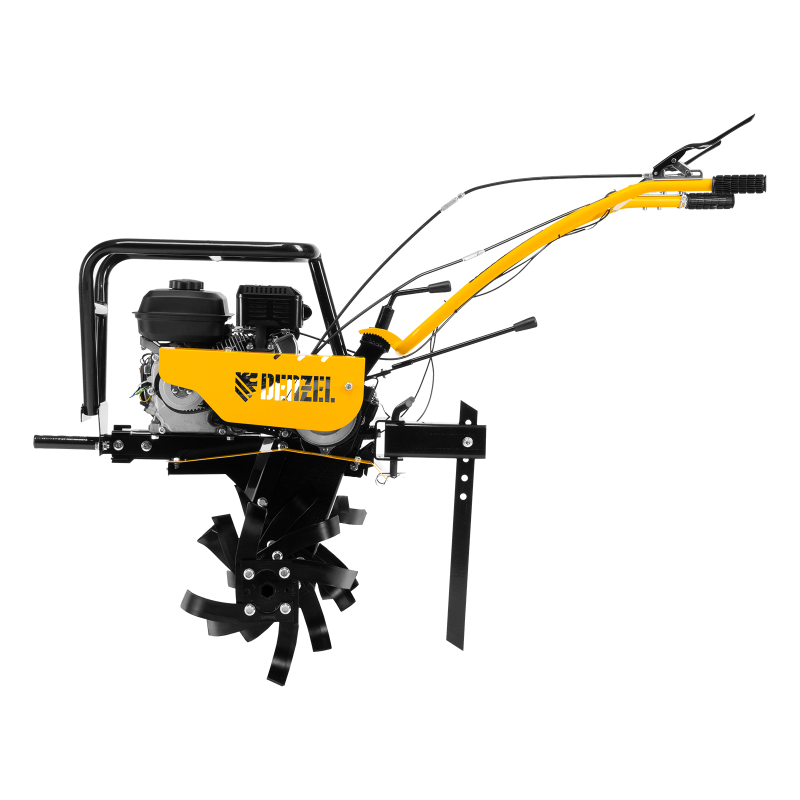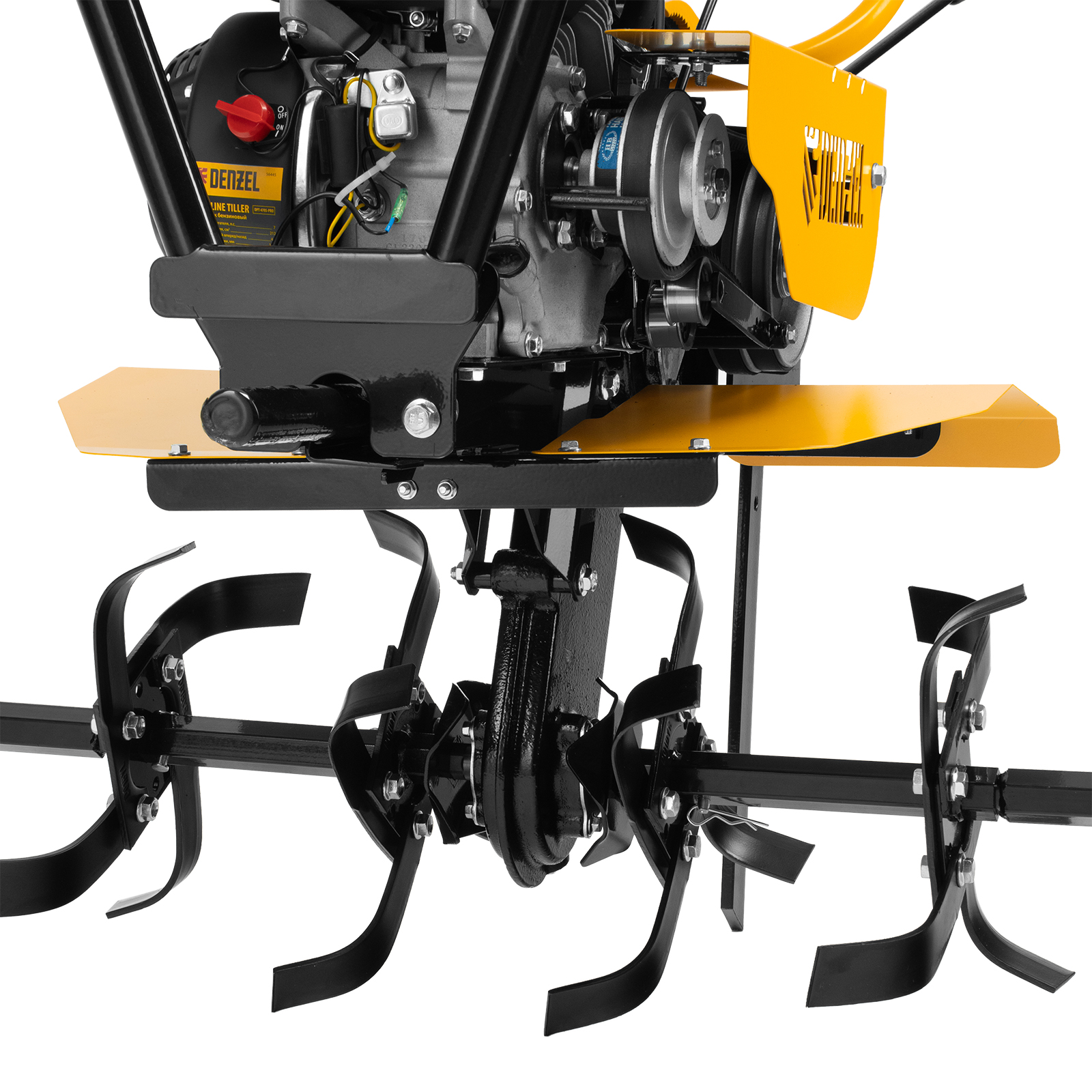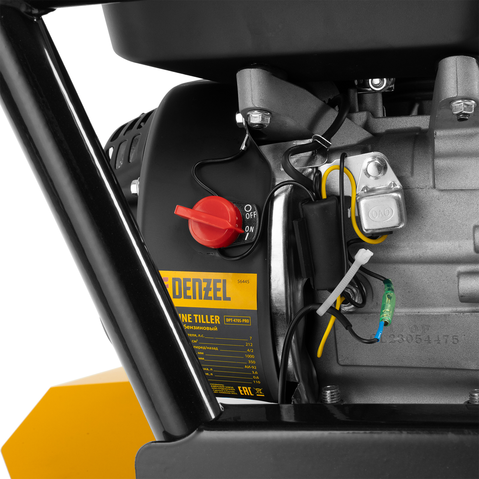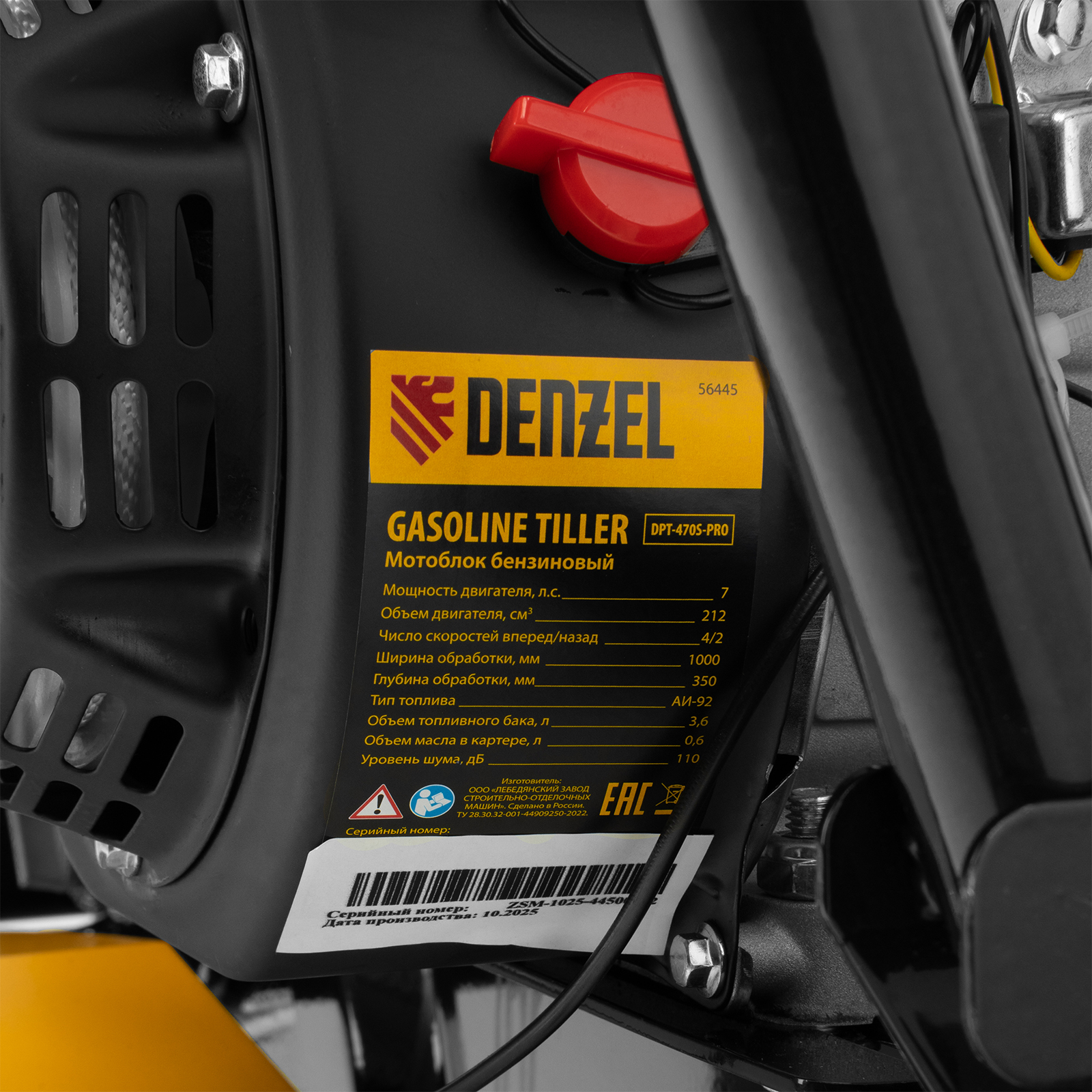 Мотоблок Denzel DPT-470S-PRO 56445 с ременным сцеплением, двигателем объемом 212 см3 и мощностью 7 л.с., с коробкой передач 4 вперед/2 назад и шкивом отбора мощности, комплектуется 24 фрезами (3х4). Предназначен для выполнения земляных работ: прополки, вспахивания, боронования грунта, перевозки грузов и т.д.