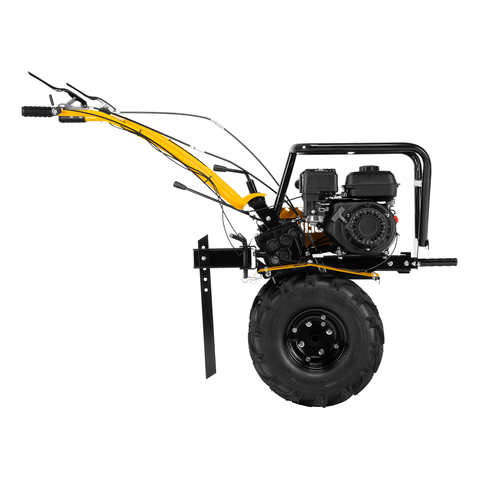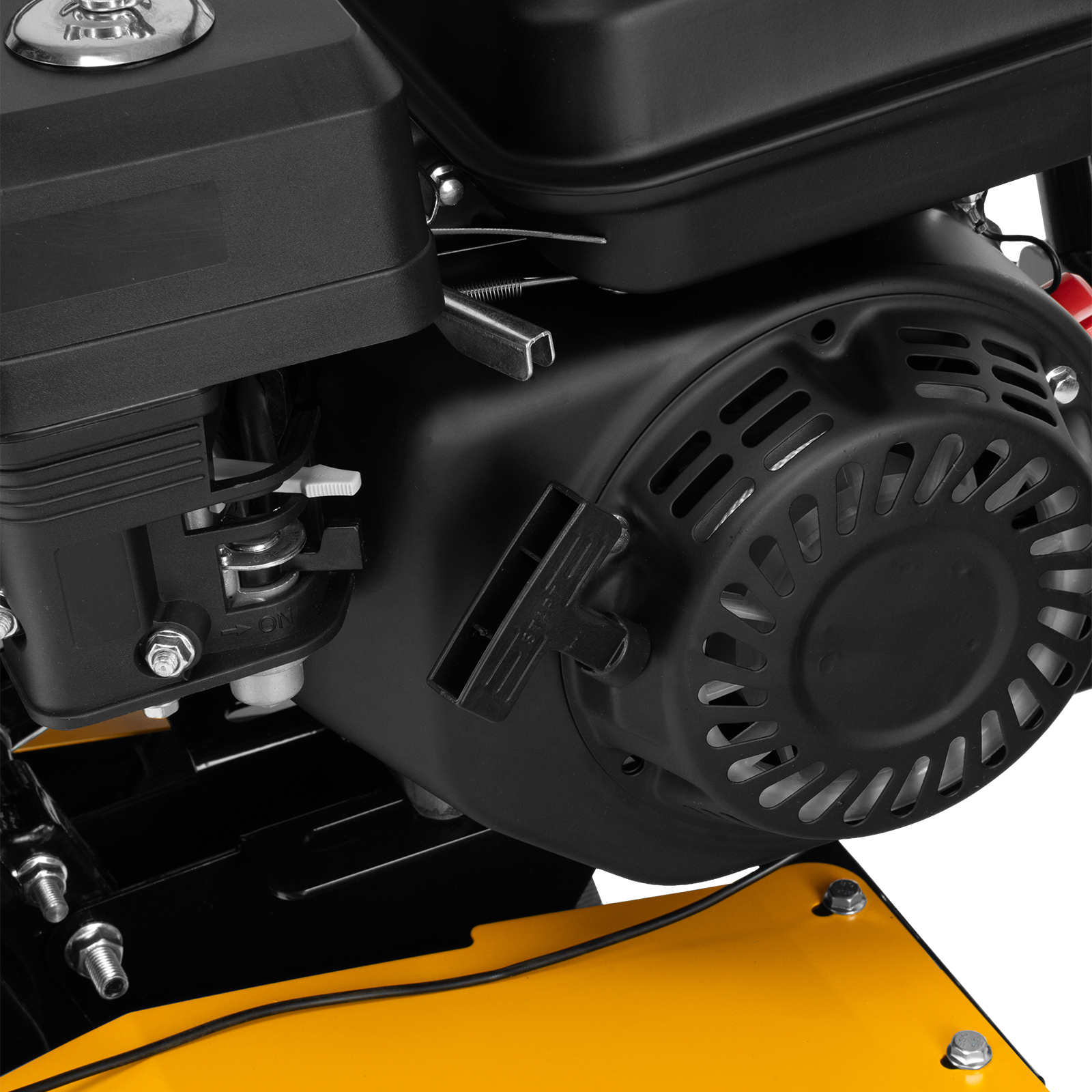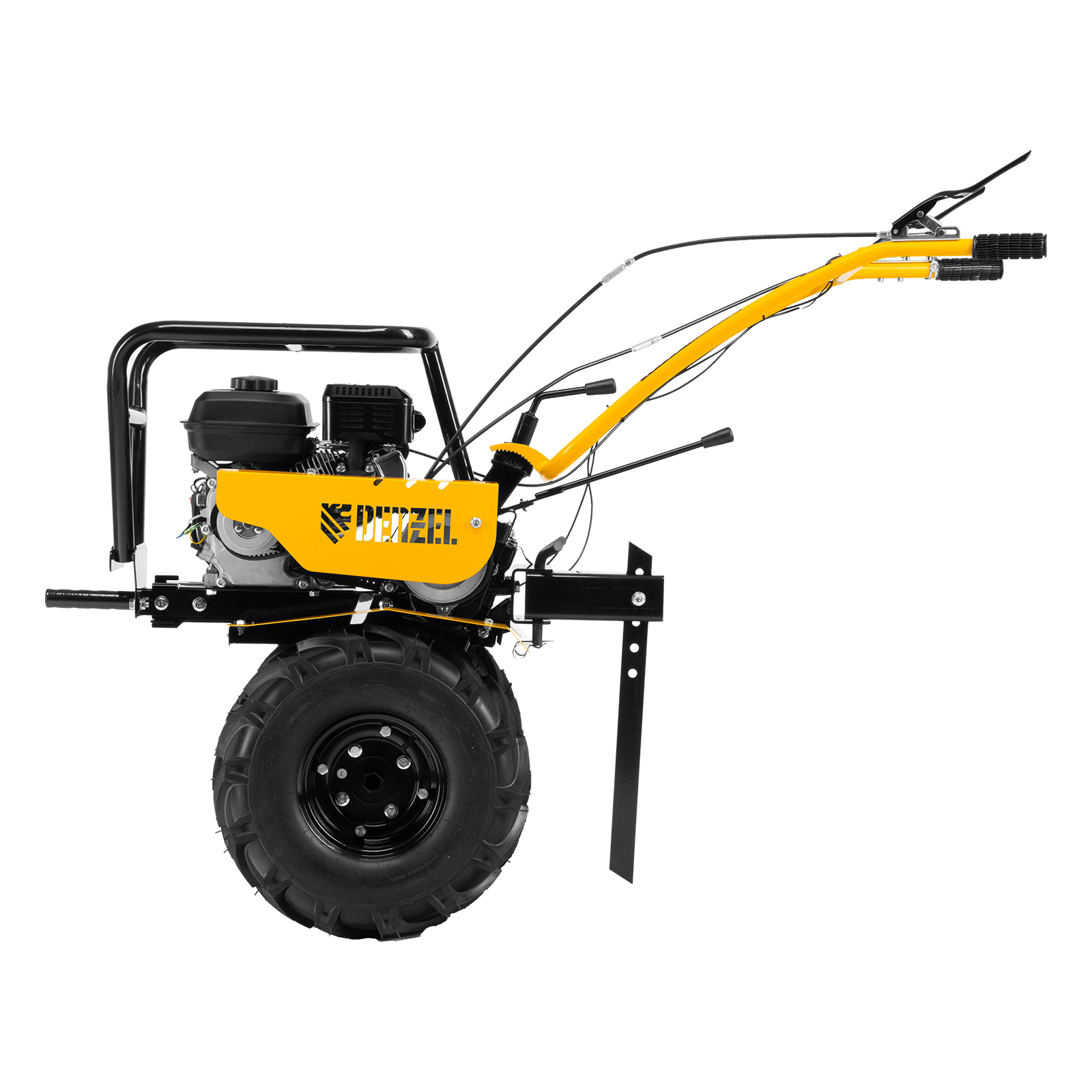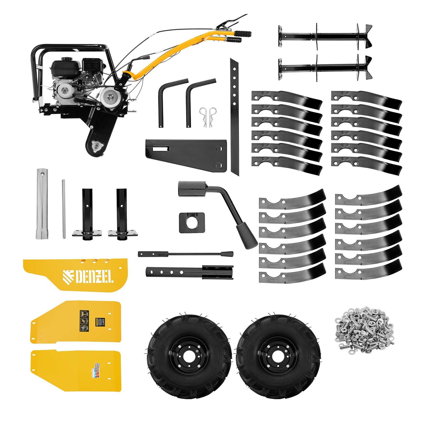 Мотоблок Denzel DPT-470S-PRO 56445 с ременным сцеплением, двигателем объемом 212 см3 и мощностью 7 л.с., с коробкой передач 4 вперед/2 назад и шкивом отбора мощности, комплектуется 24 фрезами (3х4). Предназначен для выполнения земляных работ: прополки, вспахивания, боронования грунта, перевозки грузов и т.д.