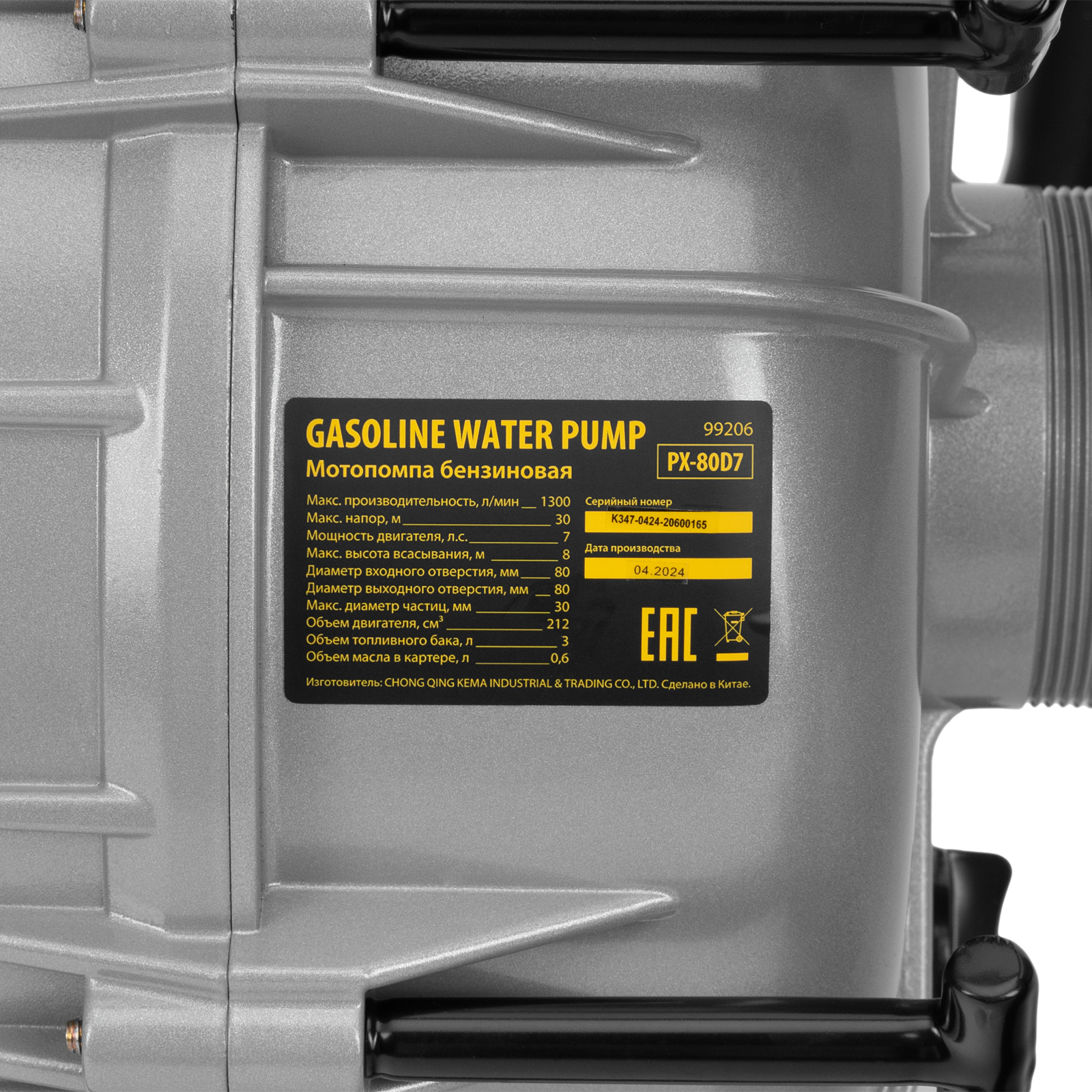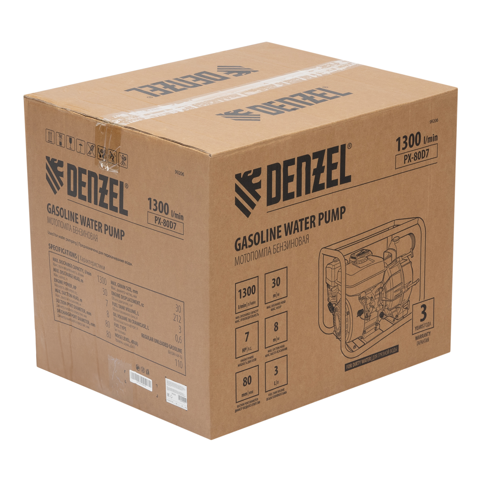 Мотопомпа бензиновая для грязной воды PX-80D7, 7 л.с., 3", 1300 л/мин, глуб 8 м,напор 30 м Denzel