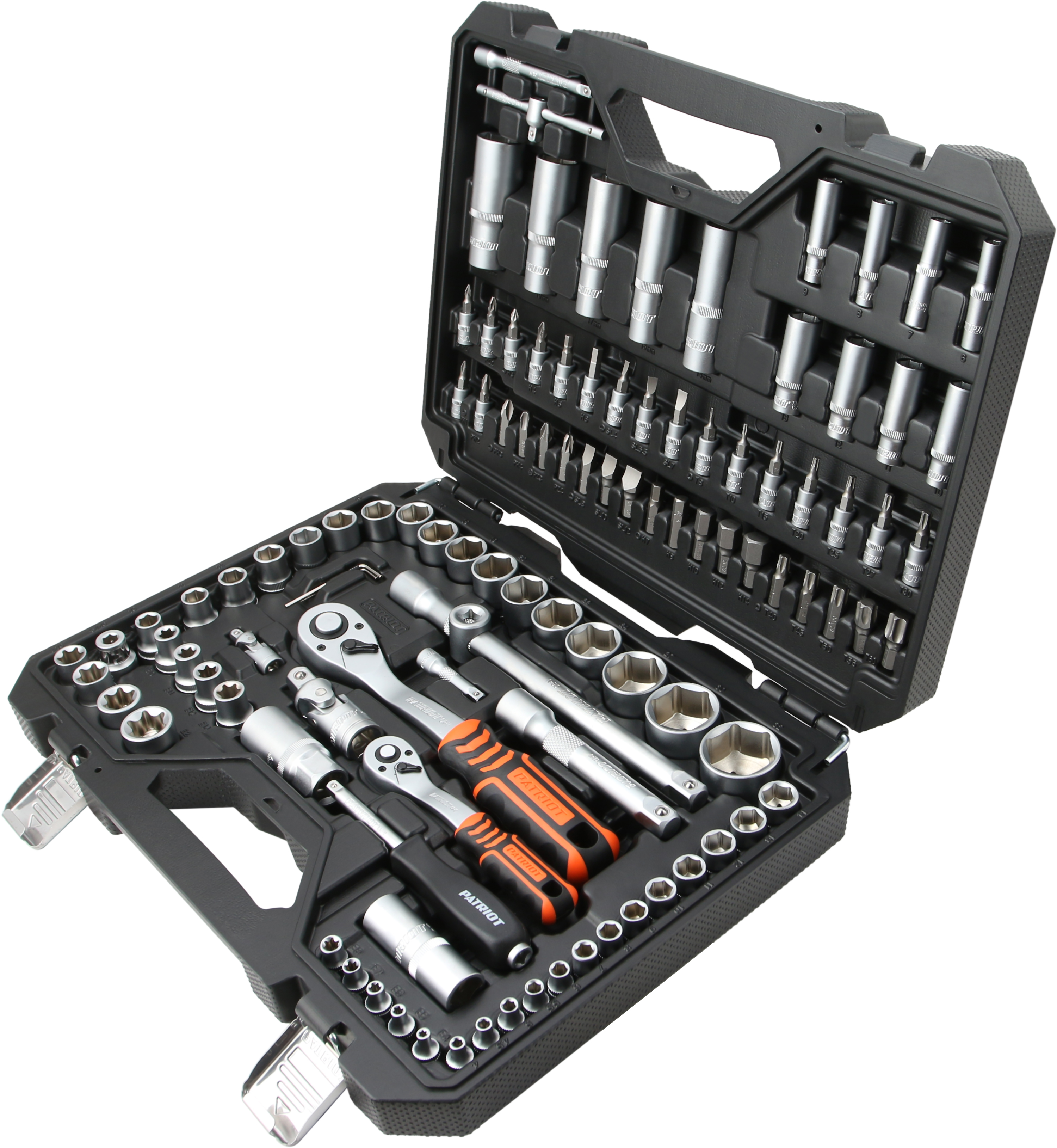 Головки 1/2:17шт.; Головки глубокие 1/2:5шт.; Головки 1/2:8шт.; Рукоятка трещоточная 1/2, 72 зубца; Удлинитель 1/2:2шт.; Адаптер-переходник 1/2; Головки свечные 1/2:2шт.; Переходник для бит 1/2 с шестигранной головкой; Шарнир карданный 1/2; Головки 1/4:13шт.; Головки глубокие 1/4:8шт.; Головки 1/4:5шт.; Рукоятка трещоточная 1/4, 72 зубца; Рукоятка-переходник для вставок-бит 1/4; Адаптер-переходник 1/4; Удлинитель 1/4:2шт.; Шарнир карданный 1/4; Торцевые головки с битами-вставками 1/4:18шт.; Биты 5/16:17шт.; Шестигранный ключ:3шт.; Кейс пластиковый |