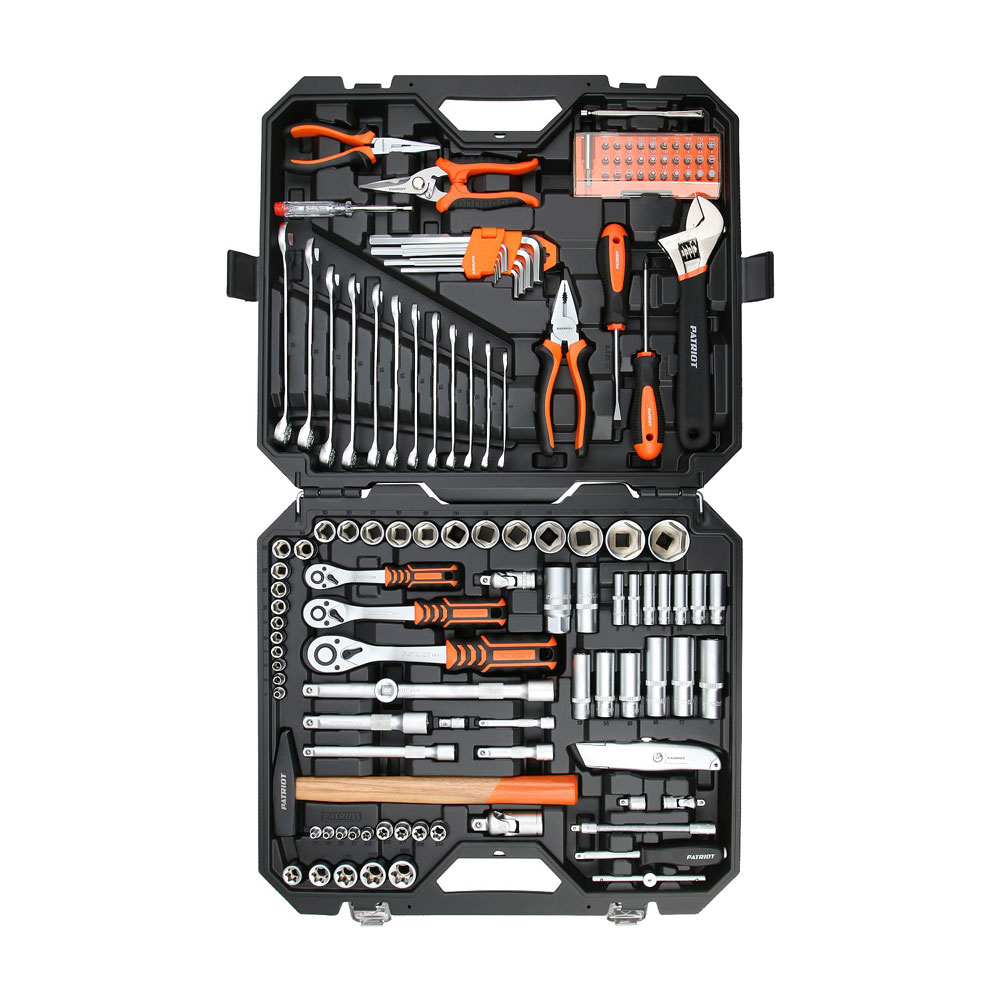 Головки шестигранные торцевые 1/4:9шт.; Головки шестигранные торцевые 1/4:7шт.; Головки шестигранные торцевые 1/4:5шт.; Соединитель-переходник 1/4 DR×1/4 HEX; Адаптер-переходник 1/2,1/4,3/8; Шарнир карданный 1/2,1/4,3/8; Удлинитель 1/4; Рукоятка-переходник для вставок-бит 1/4; Гибкий удлинитель 1/4; Рукоятка трещоточная 1/4, 72 зубца; Головки торцевые шестигранные 3/8:7шт.; Головки шестигранные торцевые 3/8:3шт.; Головки шестигранные торцевые 3/8:6шт.; Рукоятка трещоточная 3/8, 72 зубца; Удлинитель 3/8:2шт.; Головки шестигранные торцевые 1/2:7шт.; Головки шестигранные торцевые 1/2:3шт.; Головки шестигранные торцевые 1/2:3шт.; Рукоятка трещоточная 1/2, 72 зубца; Головки свечные 1/2:2шт.; Удлинитель 1/2:2шт.; Набор шестигранных ключей с держателем:9шт.; Комбинированный ключ:12шт.; Пассатижи; Тонкогубцы; Ключ разводной; Молоток слесарный; Строительный нож; Отвертка:2шт.; Тестер; Набор бит в магнитном держателе:31шт.; Ножницы; Удлинитель телескопический; Кейс пластиковый |