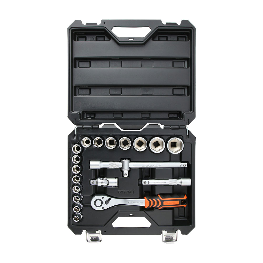 Набор инструментов автомобильный включает в себя 20 предметов из высококачественной хромованадиевой стали (Cr-V). Хромированное покрытие препятствует образованию коррозии и ржавчины. Реверсивная трещотка (72 зуба, шаг 5 градусов) с кнопкой быстрого съема головки. Двухкомпонентная рукоятка имеет насечки, подпальцевые выемки и резиновые вставки для снижения нагрузки на запястье.