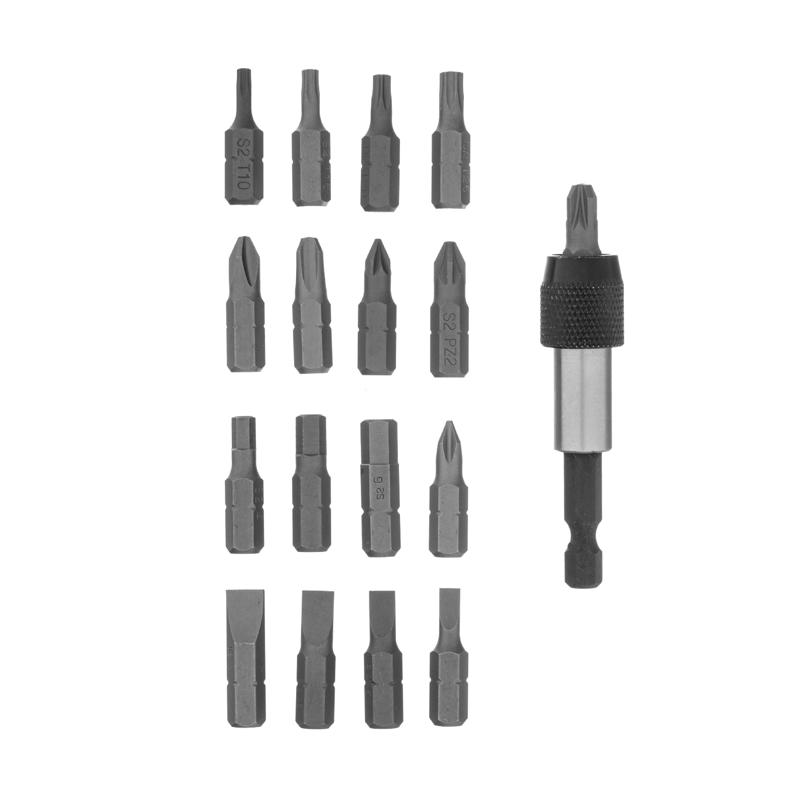 Пластиковый кейс - 1 штБиты: PH1, PH2, PH3, PZ1, PZ2, PZ3, SL4, SL5, SL6, SL7, T10, T15, T20, T25, H4, H5, H6 - 17 штБитодержатель с быстрозажимным механизмом - 1 штДержатель бит - 1 шт |