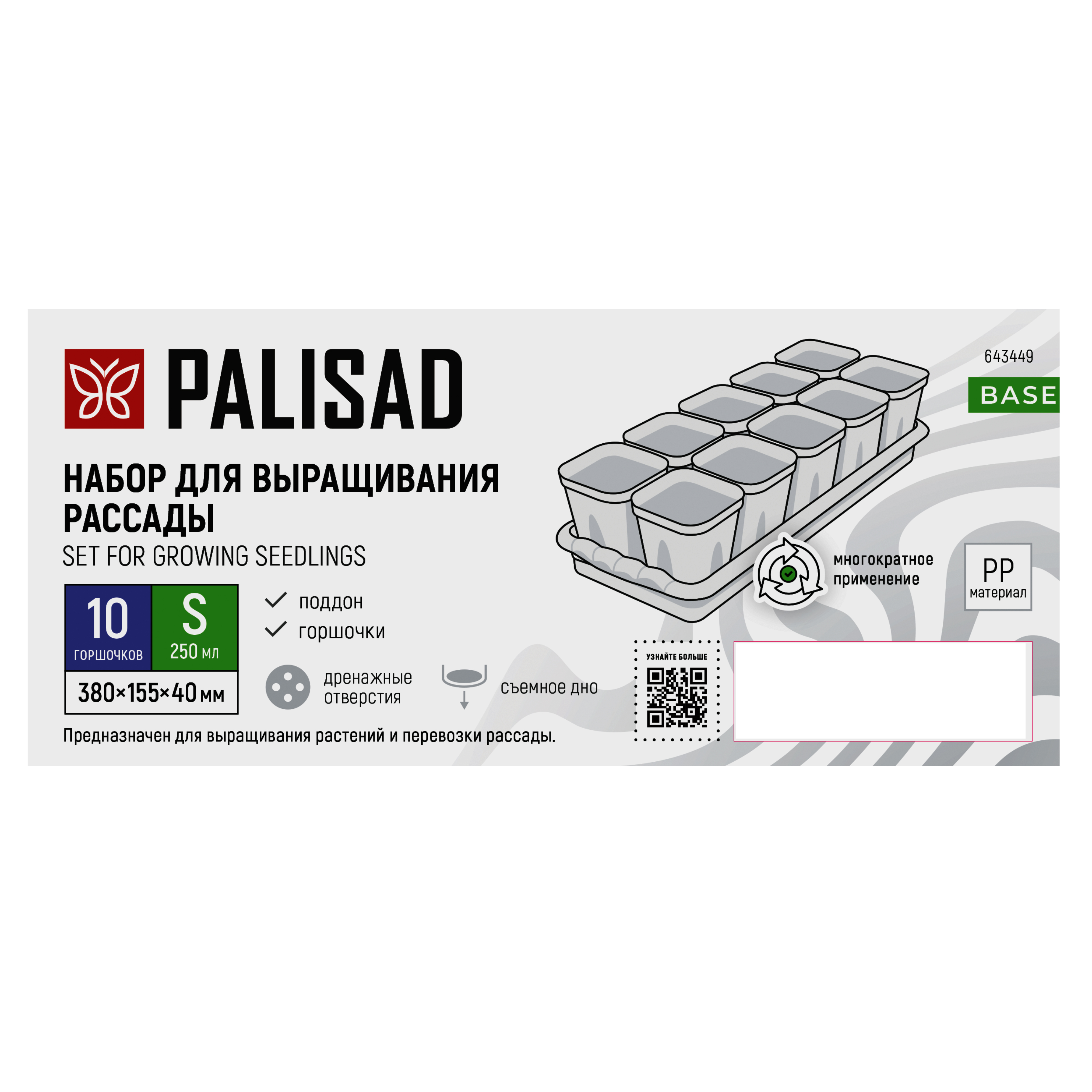 Набор для рассады Palisad 643449 состоит из 10 горшочков объемом 250 мл, с выдвижным дном, и поддона размером 380 х 155 х 40 мм. Размер каждого горшочка составляет 70 х 70 х 85 мм. Набор предназначен для выращивания молодых растений и транспортировки их к месту пересадки в открытый грунт.