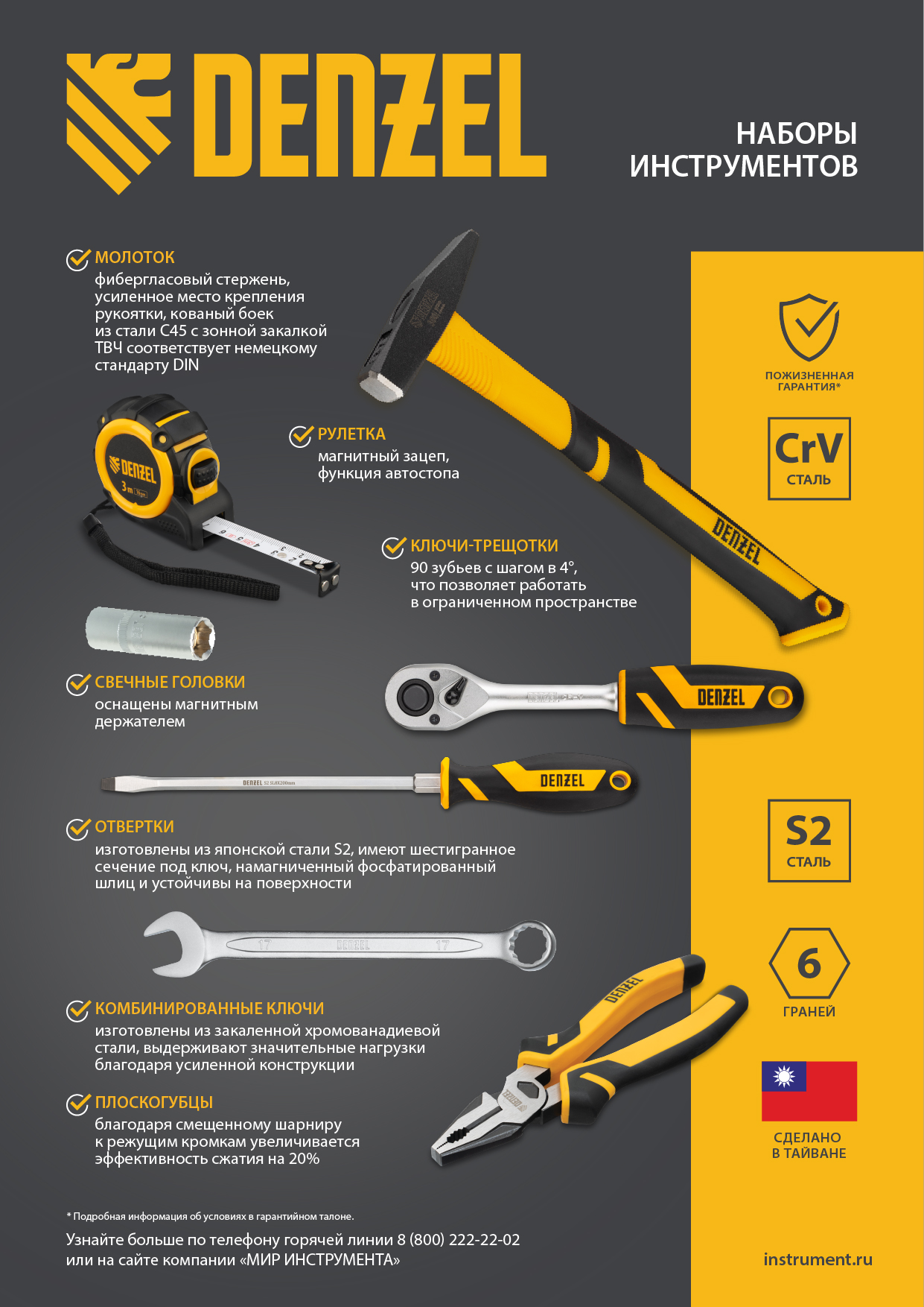 - Устойчивость к высоким нагрузкам — инструменты изготовлены из высокопрочной закаленной стали CrV, биты и отвертки выполнены из японской стали S2.