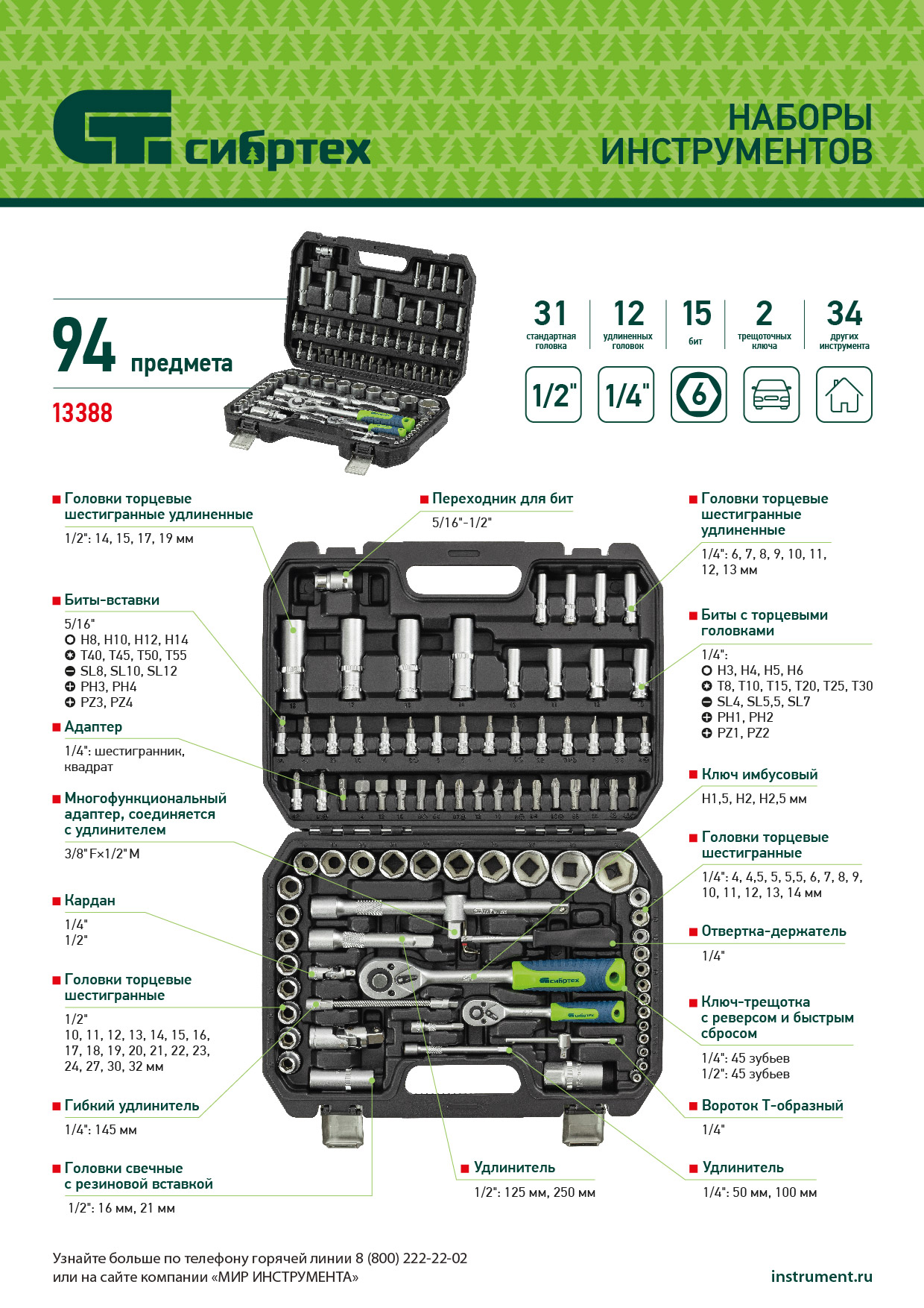 Набор инструментов, 1/2", 1/4", пластиковый кейс, 94 предмета// Сибртех |