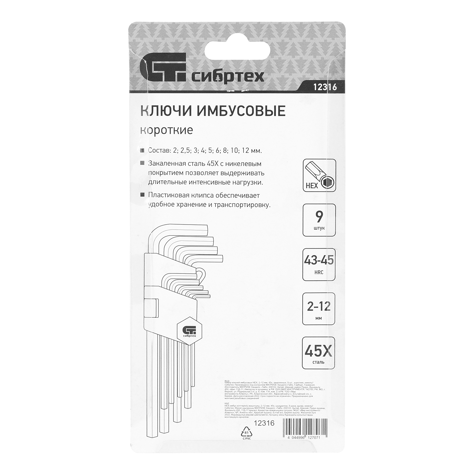 Набор ключей имбусовых HEX, 2-12 мм, 45x, закаленные, 9 шт, короткие, никель Сибртех