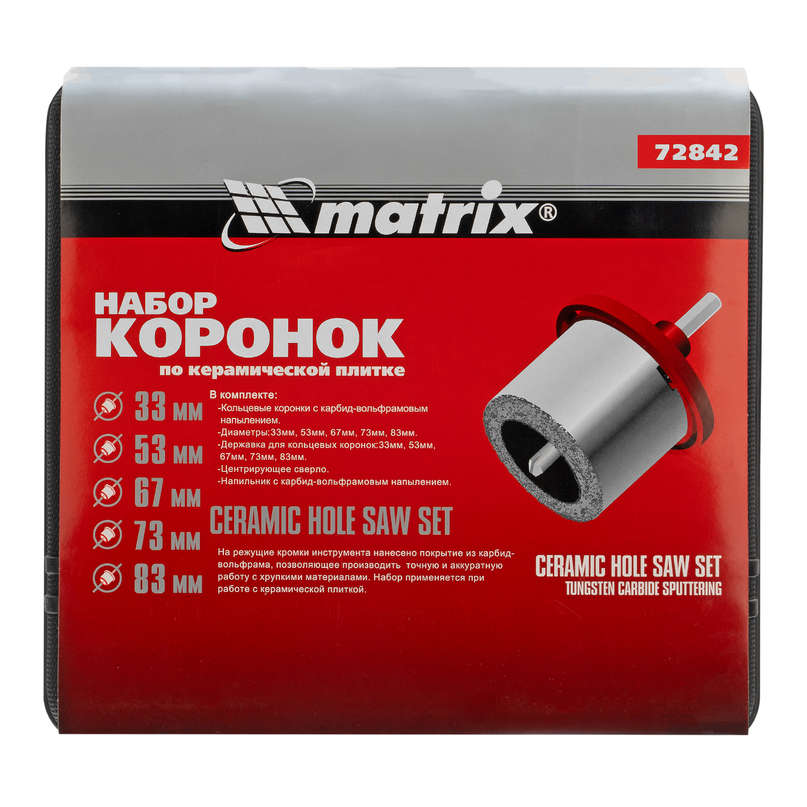Набор коронок по керамической плитке, 33-53-67-73-83 мм, напил, в пластиковом боксе, шестигранный хвостовик Matrix
