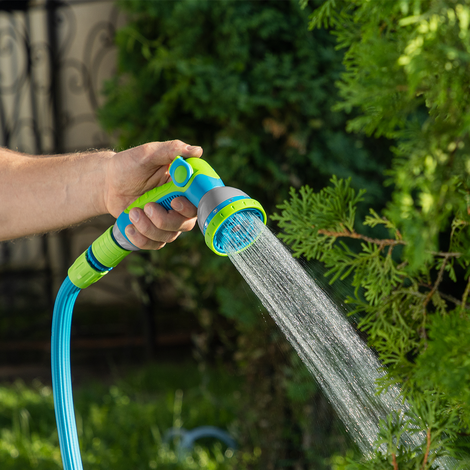 - Надежность и устойчивость к износу — силиконовый шланг с TPR-покрытием не деформируется, не перекручивается и не образует заломов, пистолет-распылитель из ударопрочного ABS-пластика устойчив к повреждениям.