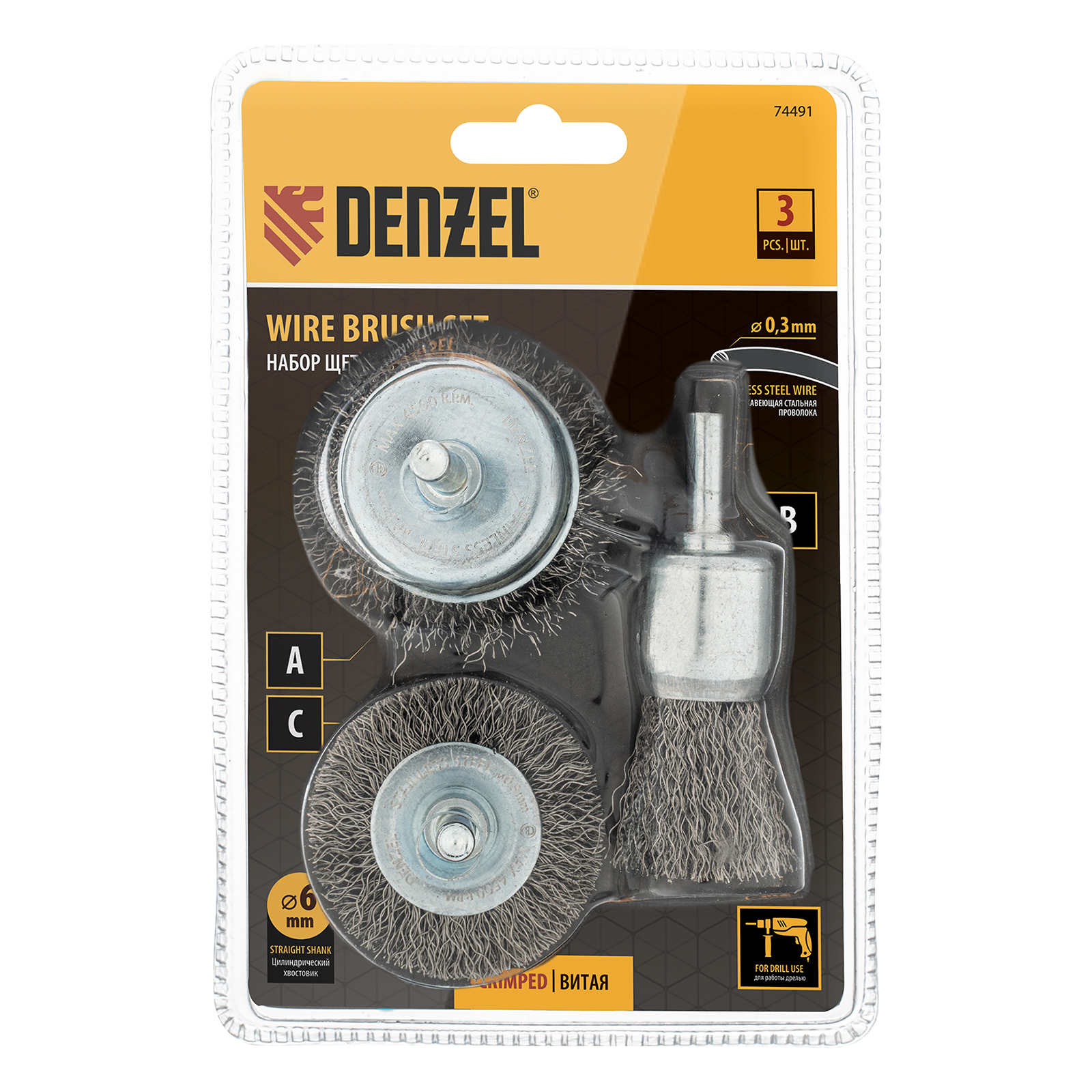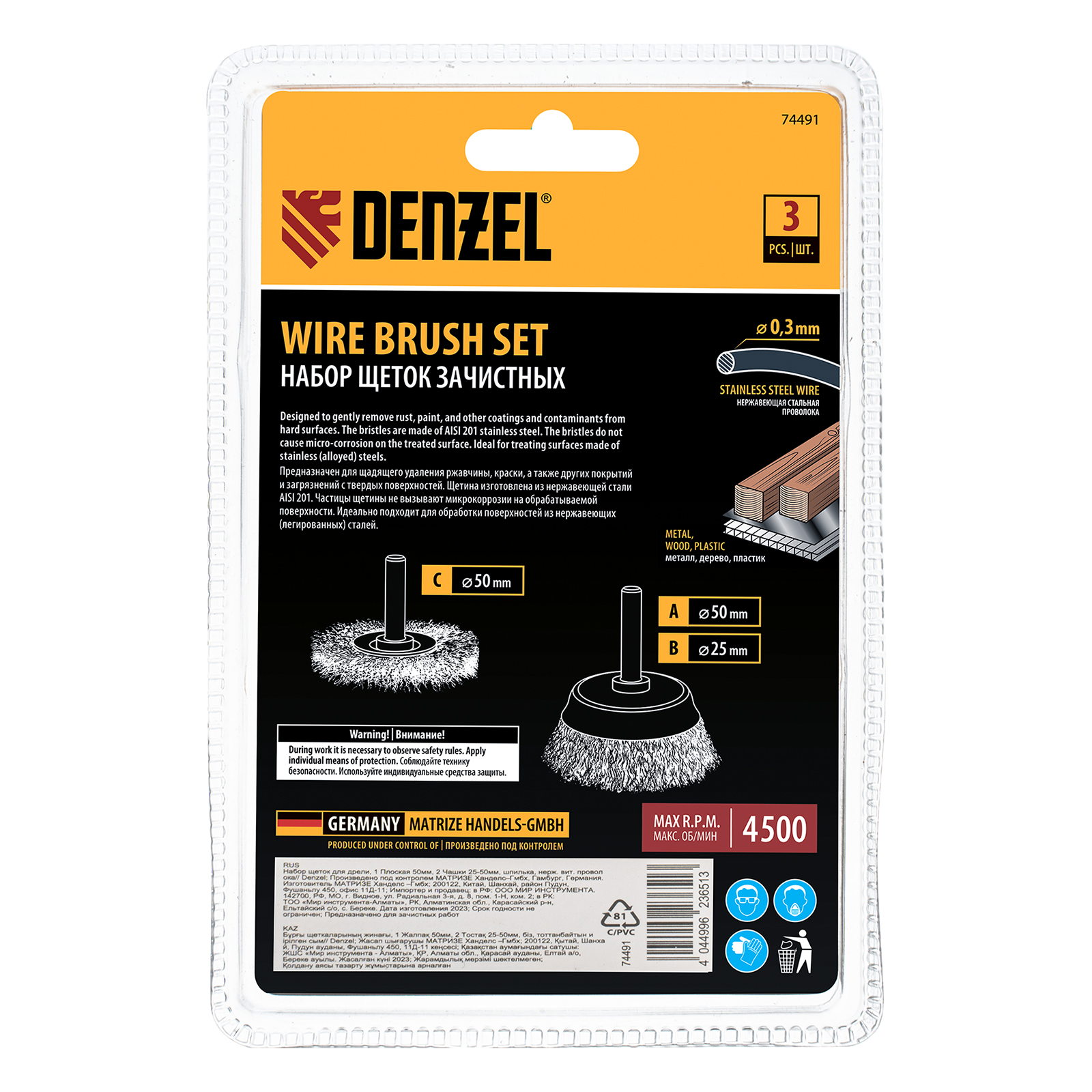 Набор щеток для дрели, 1 Плоская 50мм, 2 Чашки 25-50мм, шпилька, нерж. вит. проволока Denzel |