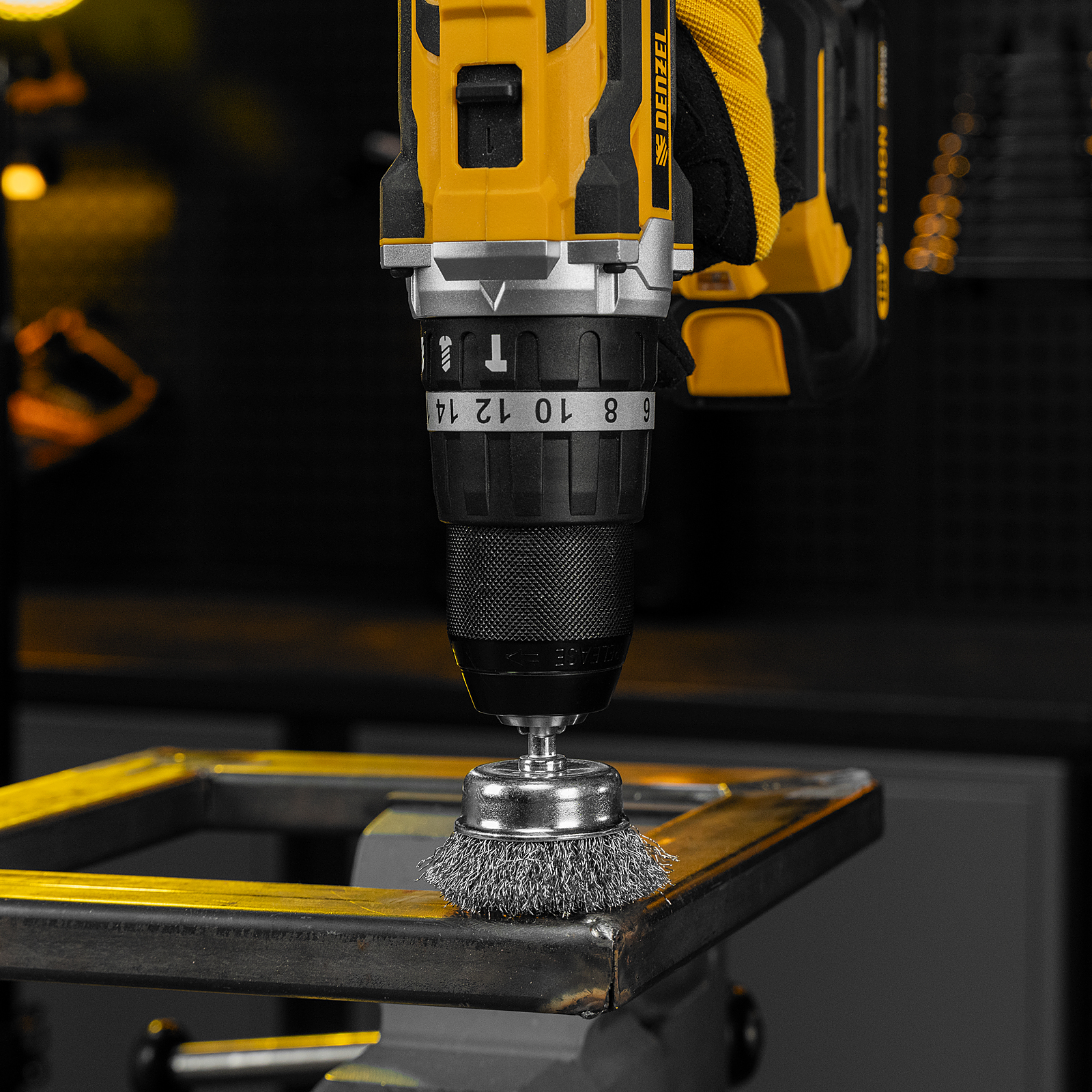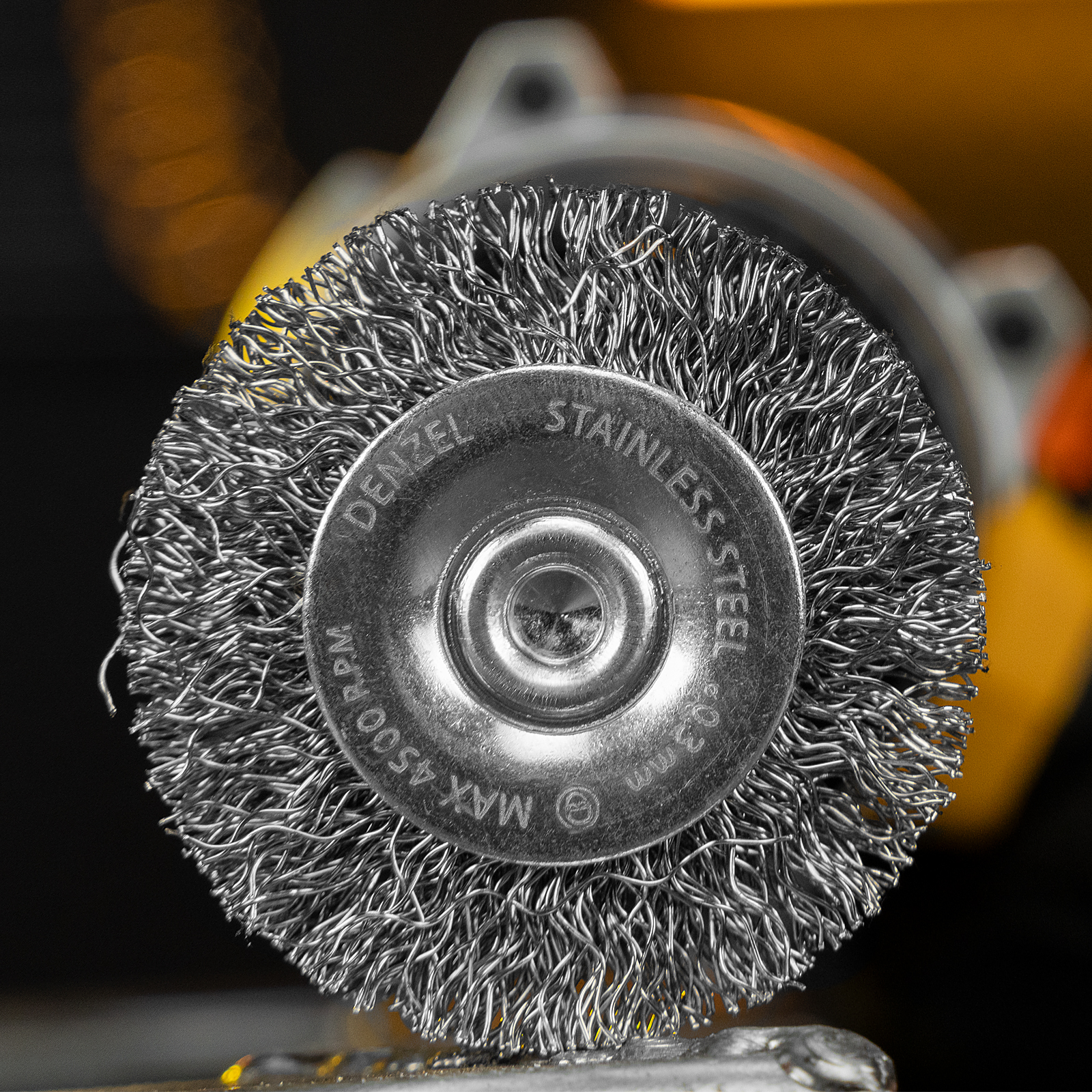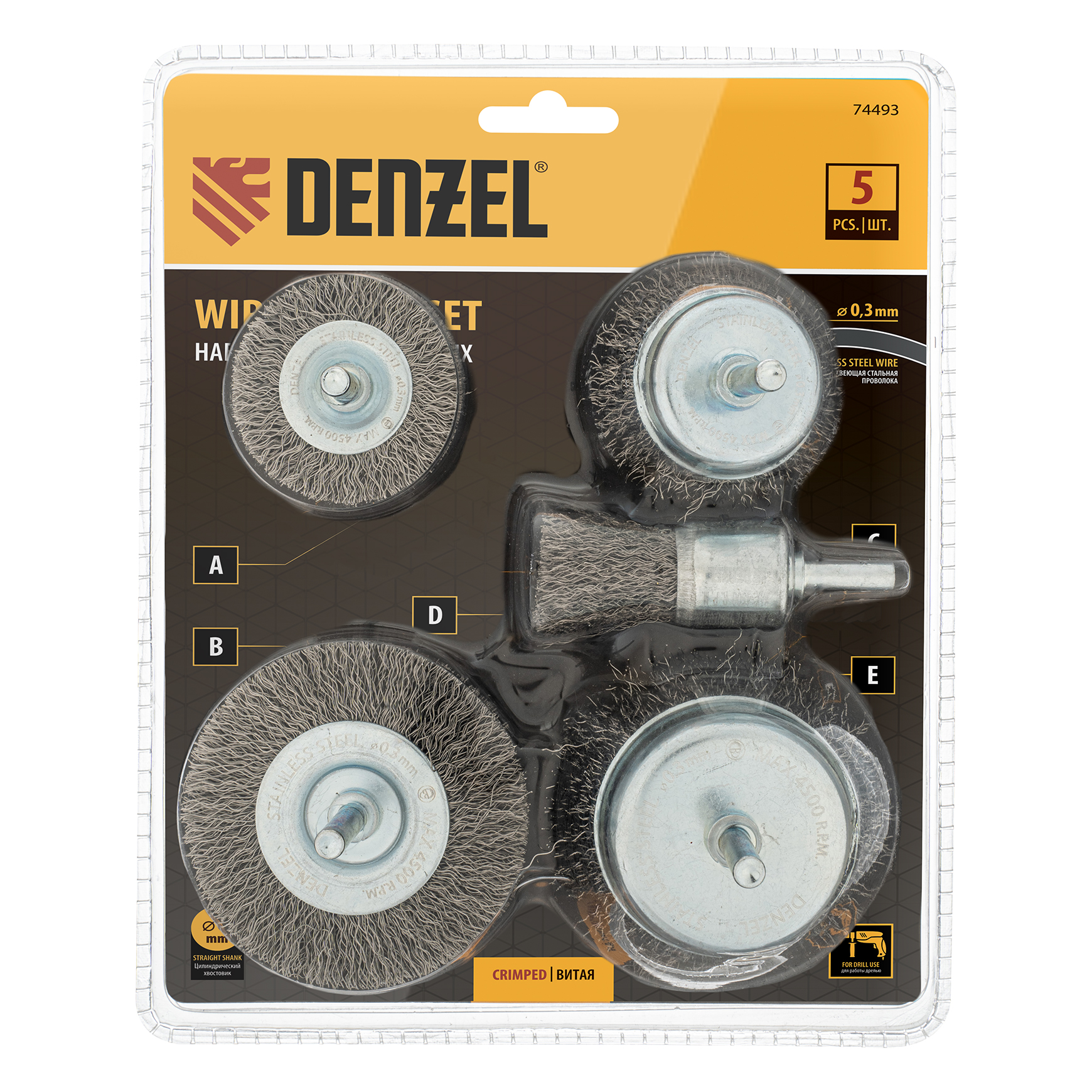 Набор щеток для дрели, 2 Плоские 50-75мм, 3 Чашки 25-50-75мм, шпилька, нерж.вит. проволока Denzel