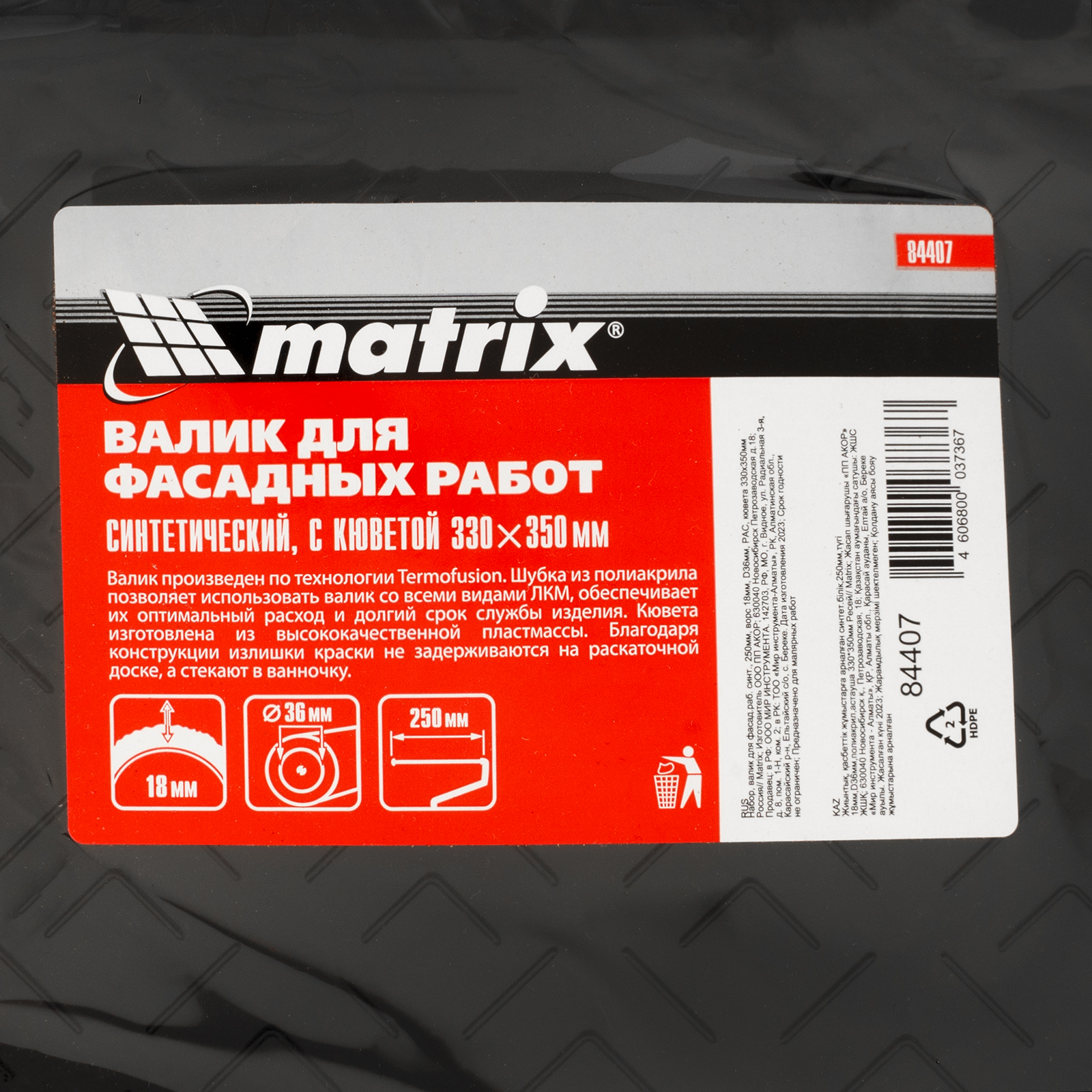 Набор Matrix 84407 включает в себя кювету размером 330 х 350 мм и синтетический валик для фасадных работ с ворсом 18 мм из полиакрила, шириной 250 мм и диаметром 36 мм. Валик используется для окрашивания фасадов зданий, необработанной древесины, участков с грубой штукатуркой, кирпича, бетона, гофрированного металла и других текстурных поверхностей. Полиакрил подходит для работы с лакокрасочными материалами на водной основе и на основе растворителей. Длинноворсовая шубка отлично прокрашивает неровности без разбрызгивания ЛКМ. Универсальная кювета предназначена для набора краски, раскатывания и отжима валиков шириной до 250 мм.