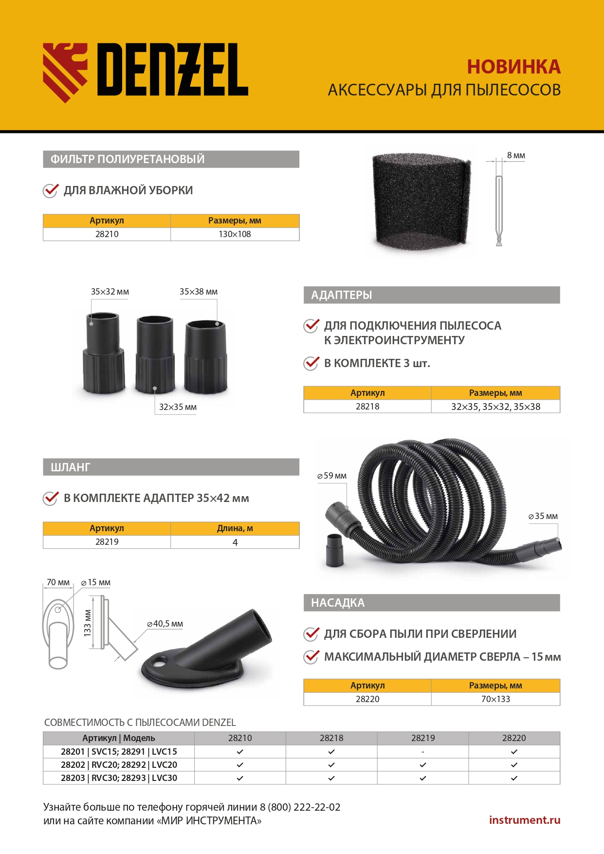 Насадка для пылесоса Denzel 28220 предназначена для моментального сбора пыли, образующейся при сверлении поверхностей. Подходит для использования со сверлами диаметром до 15 мм. Пригодится во время проведения строительных и ремонтных работ. Насадка совместима с пылесосами Denzel 28201, 28202, 28203, 28291, 28292, 28293.