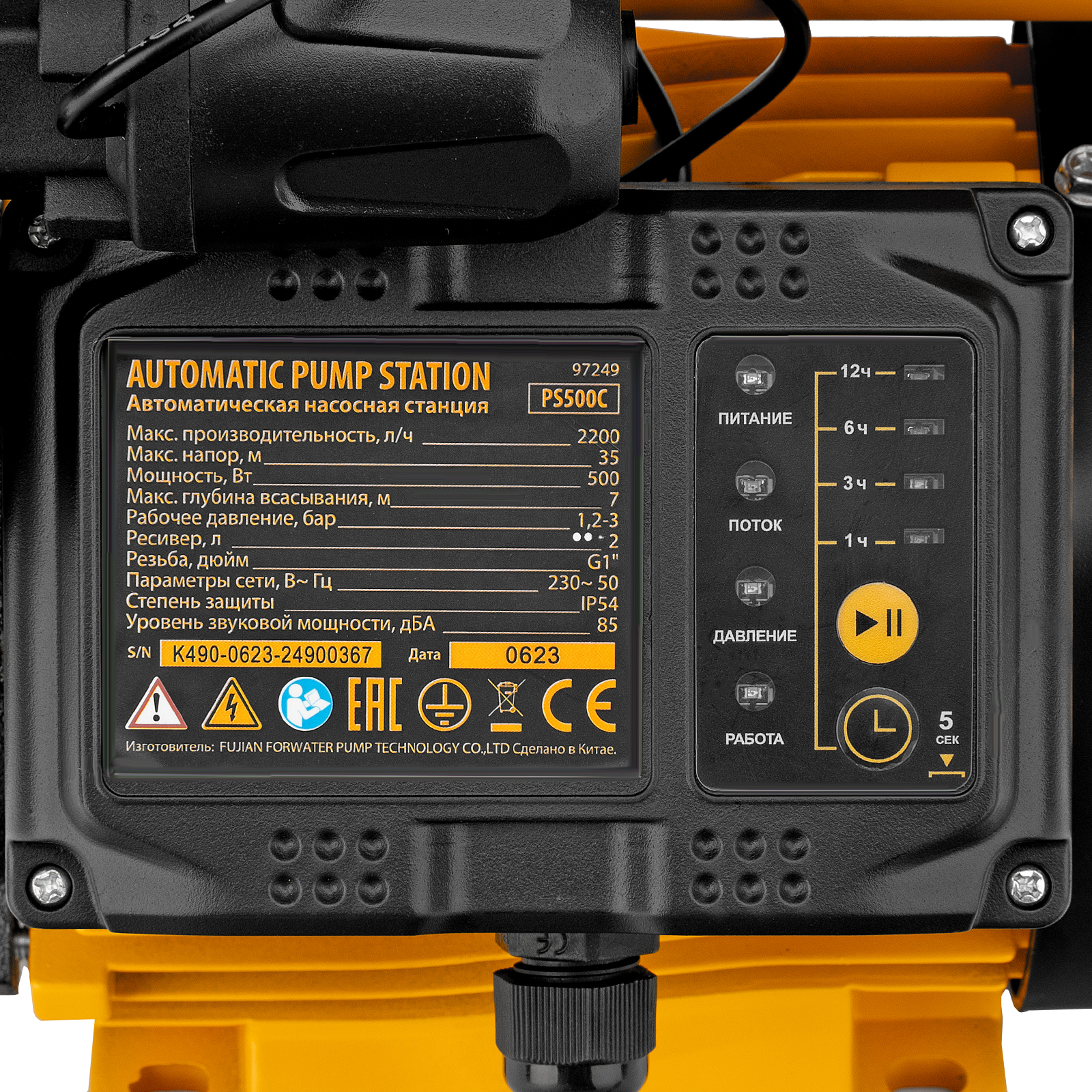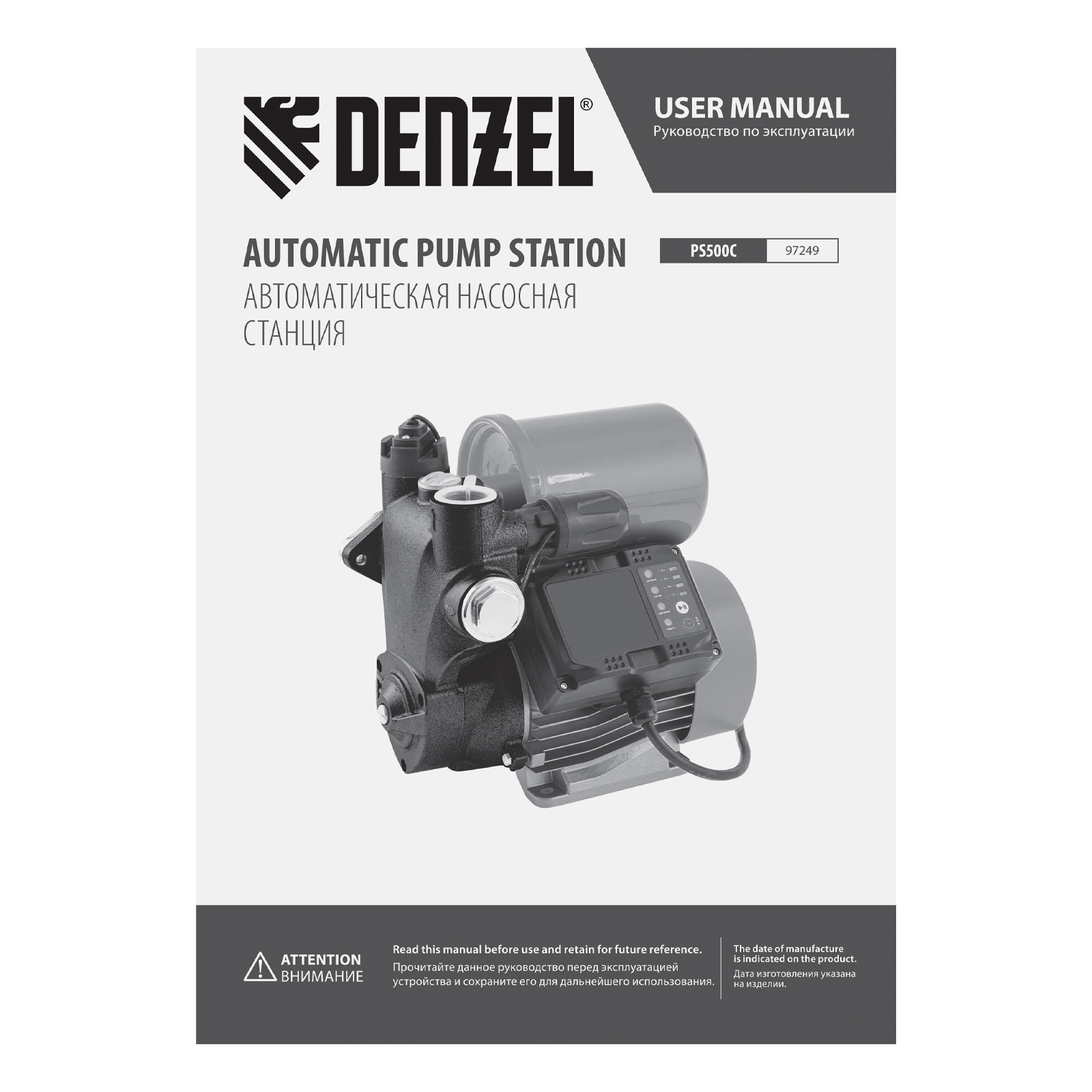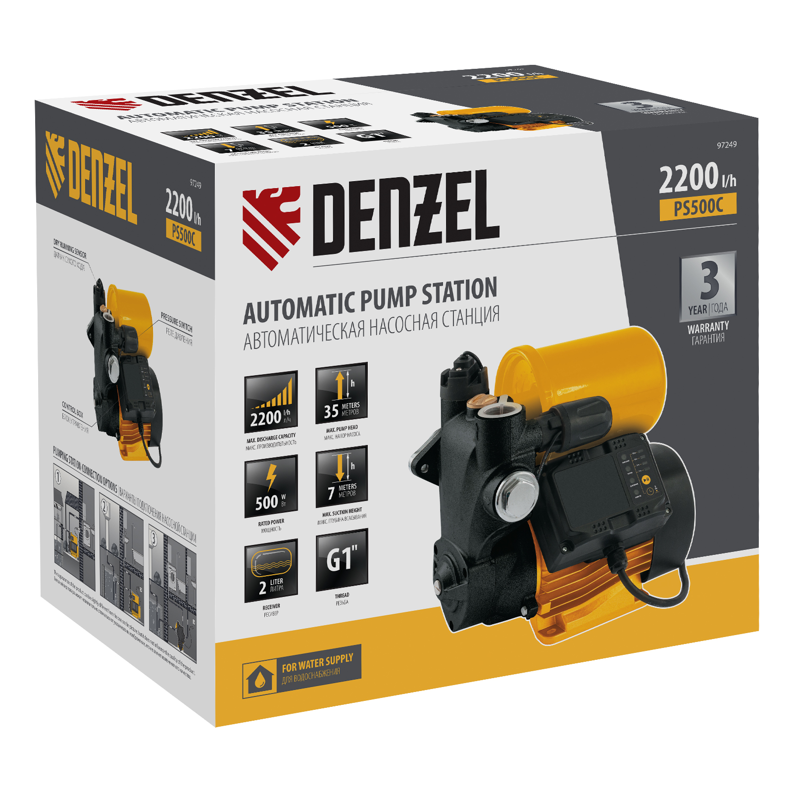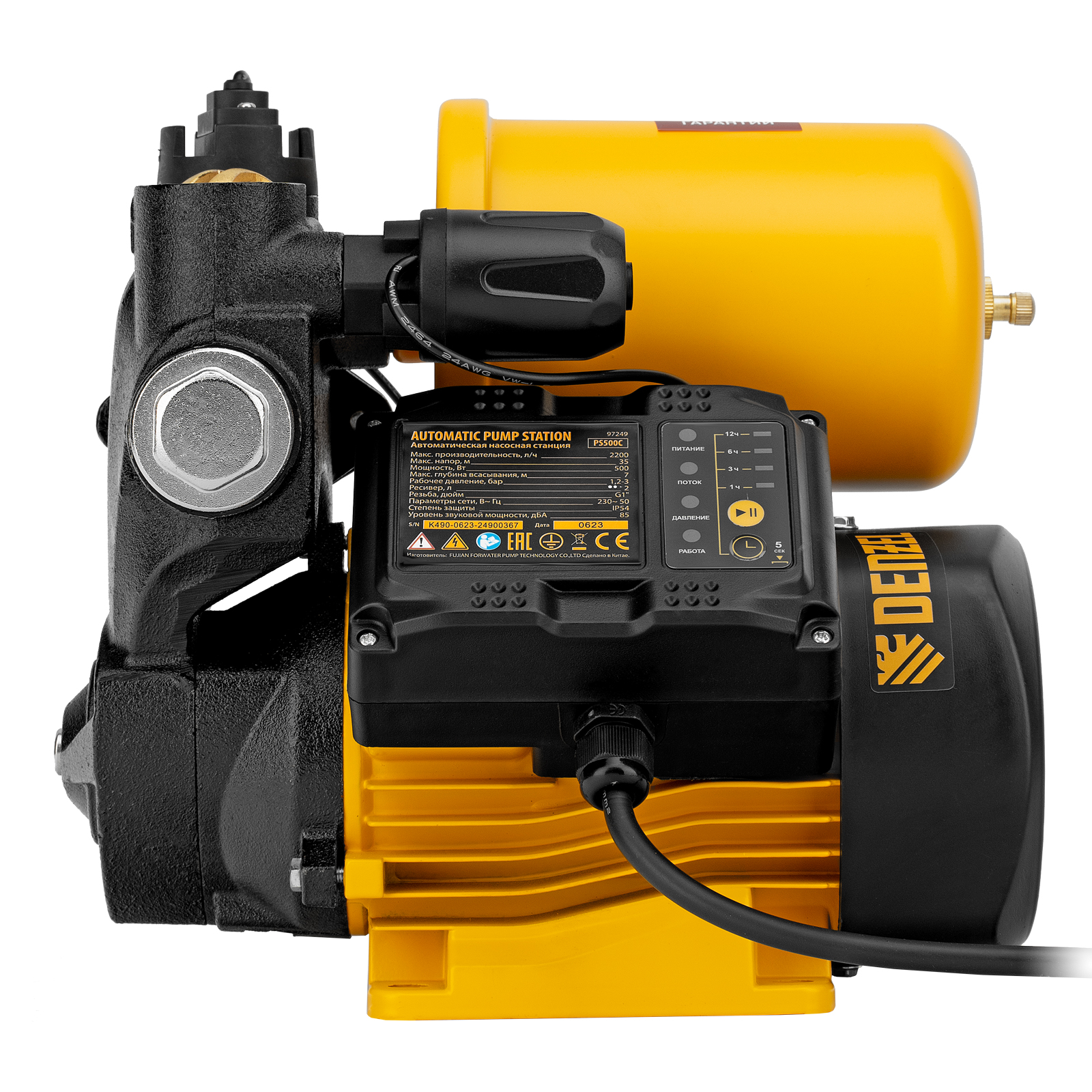 Насосная станция PS500C, 500 Вт, напор 35 м, 2200 л/ч, ресивер 2 л, блок управления Denzel