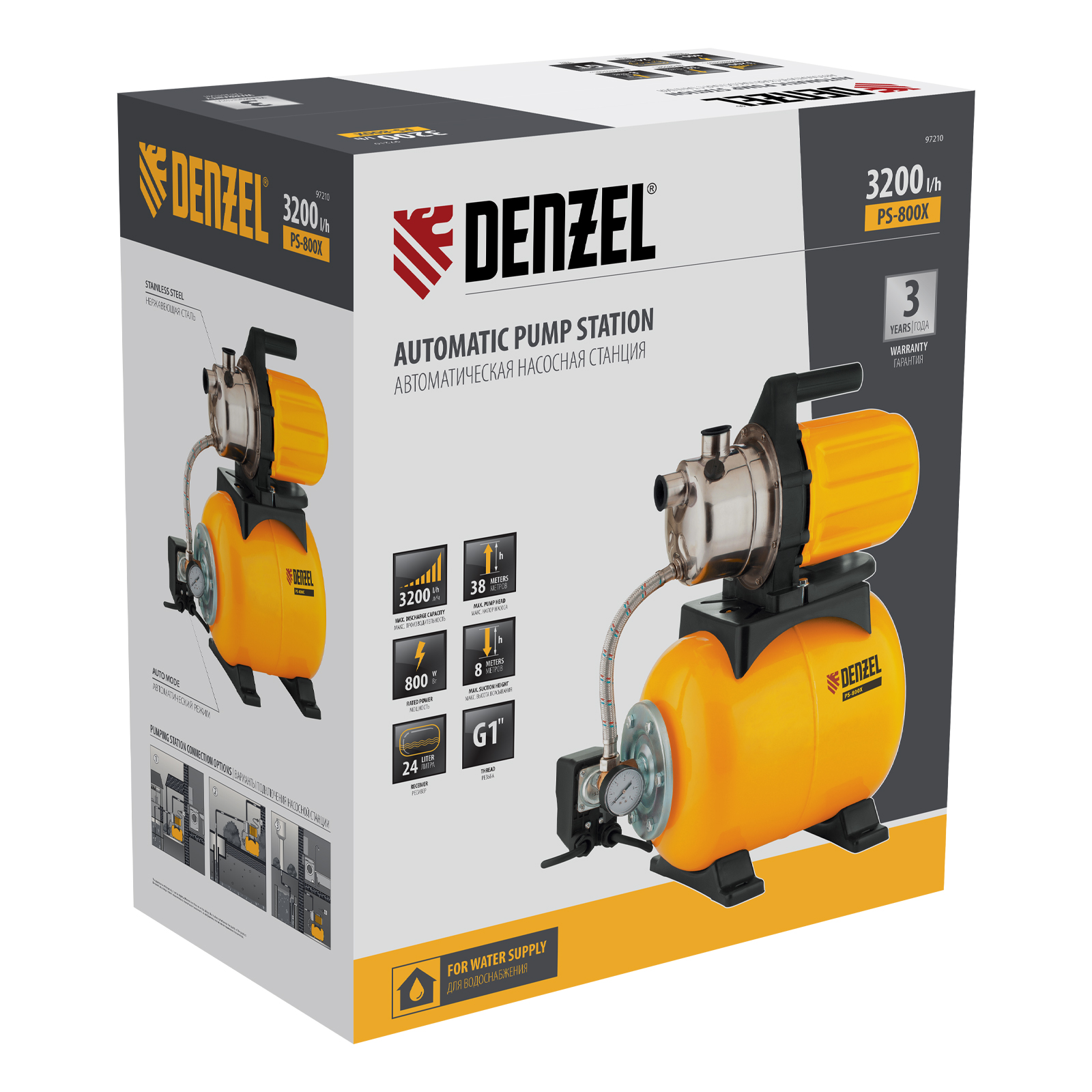 Насосная станция PS800X, 800 Вт, 3200 л/ч, ресивер 24 л, подъем 38 м, нержавейка Denzel