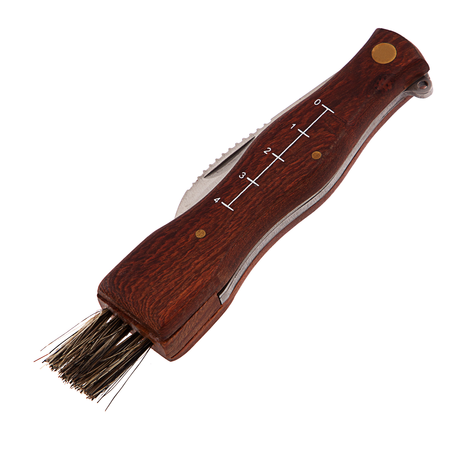 - Нож оснащен кисточкой из натуральной щетины для очищения шляпок грибов от мелких листьев, хвои и другого мусора.