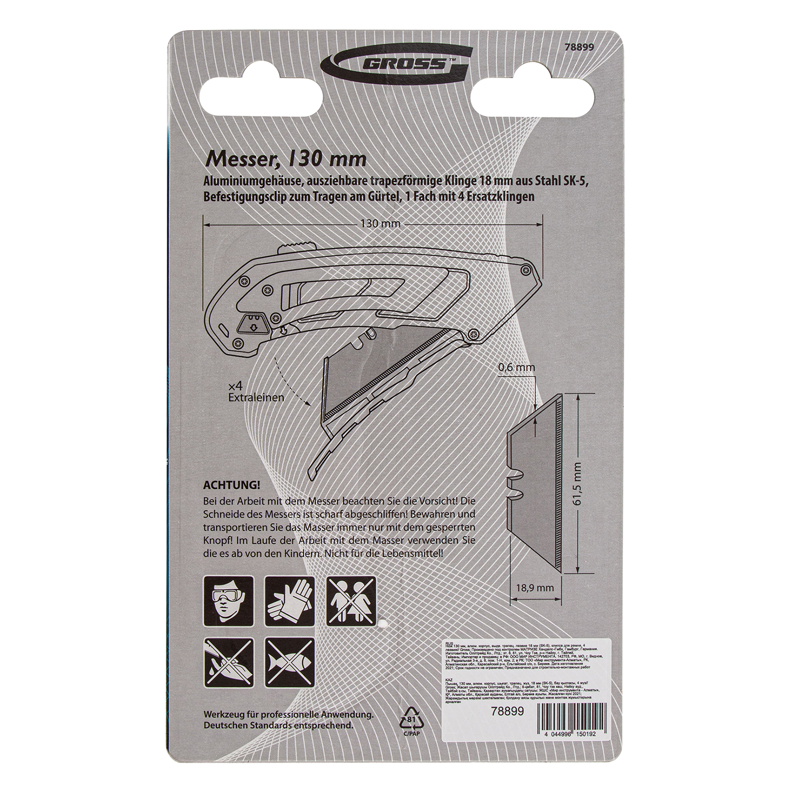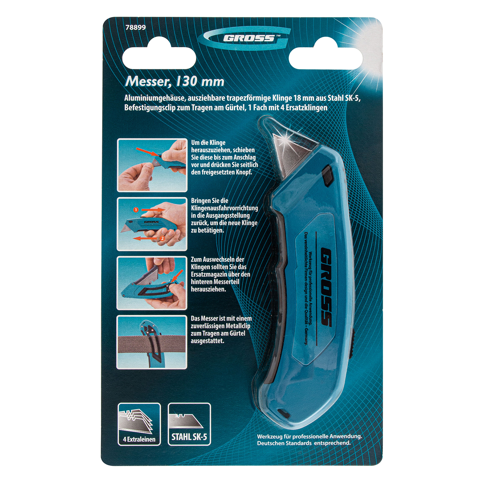 Нож Gross 78899 из стали SK-5, длиной 130 мм, с алюминиевым корпусом, выдвижным трапециевидным лезвием шириной 18 мм, клипсой для ремня и 4 лезвиями, — профессиональный инструмент для разрезания картона, линолеума, обоев, кожи и других мягких материалов. Благодаря алюминиевому корпусу он отличается повышенной прочностью и коррозионной стойкостью, выдерживает длительное и частое использование. Нож будет полезен при проведении ремонтных и отделочных работ, подойдет и для бытового использования.