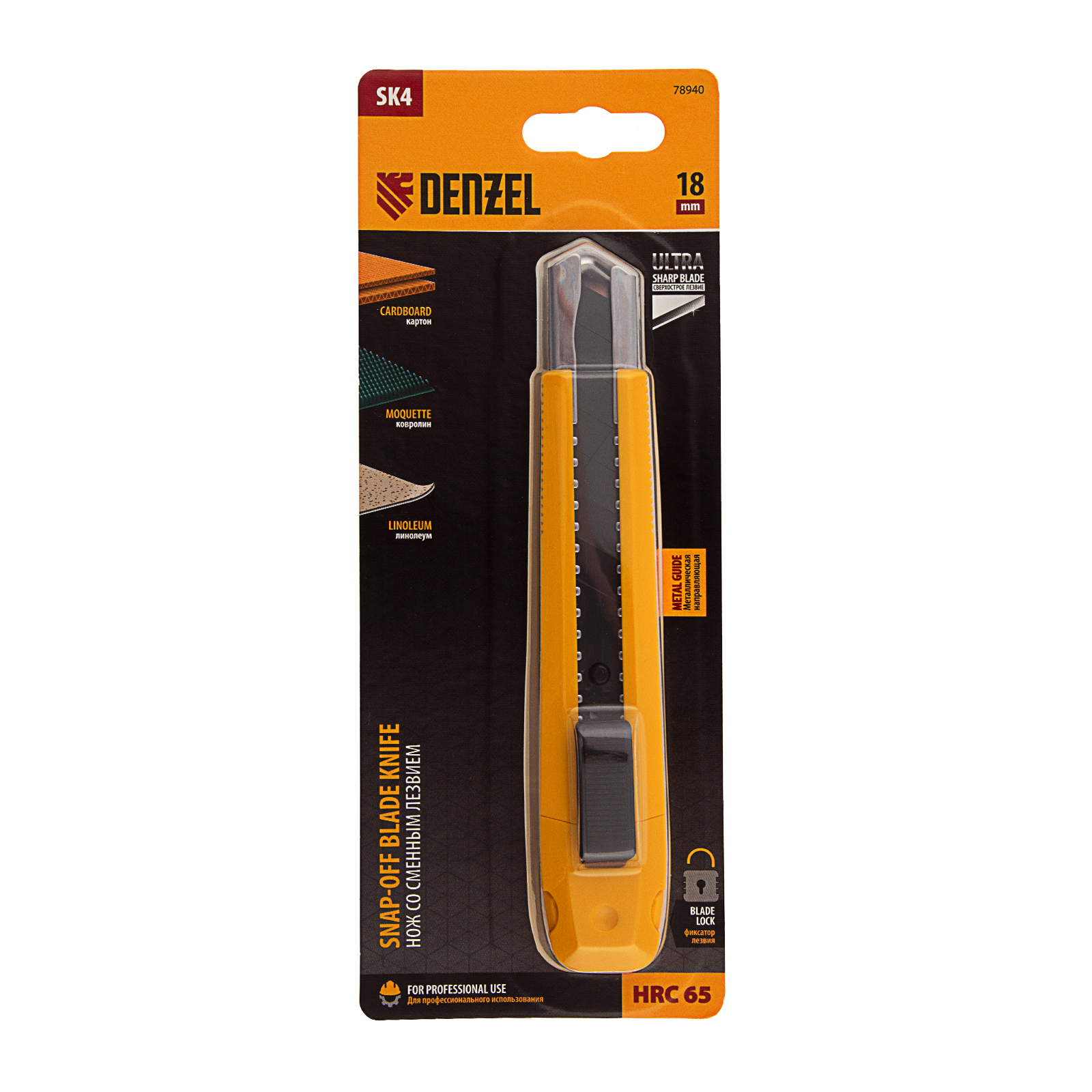 Нож, 18 мм, сменное лезвие, SK4, метал. направляющая, клипса, нажимной фиксатор Denzel