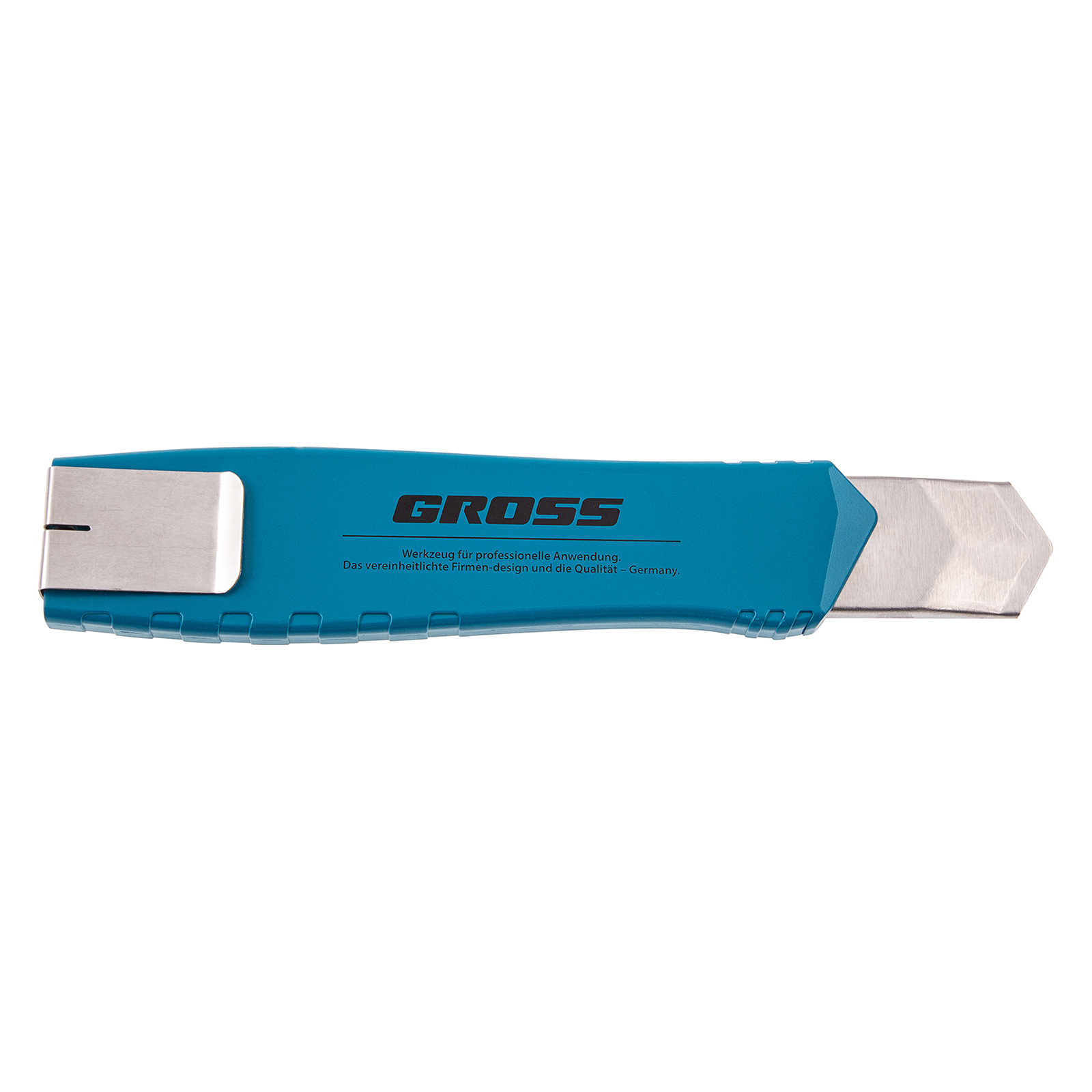 Нож Gross 78896 из стали SK-5, длиной 195 мм, в металлическом корпусе, с выдвижным сегментным лезвием шириной 25 мм, металлической направляющей и клипсой для ремня, — профессиональный инструмент, предназначенный для разрезания линолеума, картона, кожи, обоев и других материалов. Используется при проведении ремонтных и отделочных работ, будет полезен в хозяйстве.