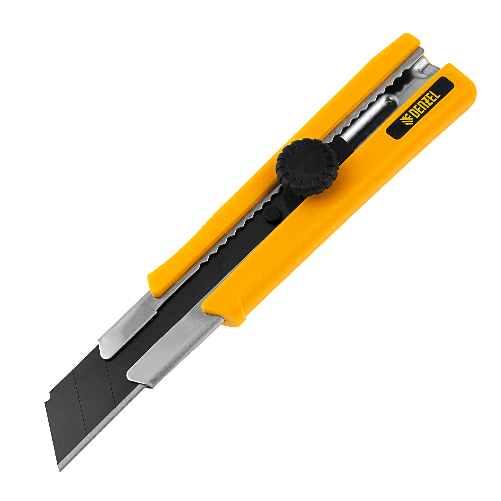 Нож, 25 мм, сменное лезвие, SK4, корпус из TPR, метал. направляющая, винтовой фиксатор Denzel