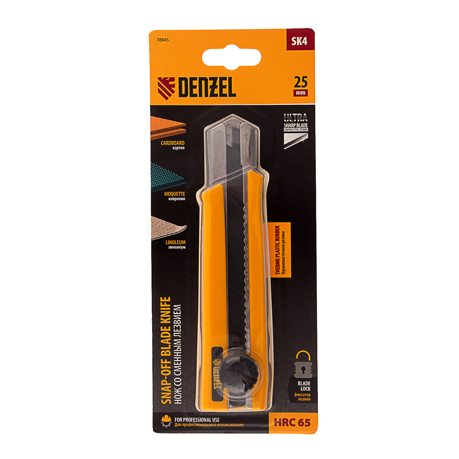 Нож Denzel 78945 выполнен в корпусе из термопластичной резины TPR, со сменным лезвием шириной 25 мм, изготовленным из стали SK4, оснащен винтовым фиксатором и металлической направляющей. Сверхострое выдвижное лезвие легко режет линолеум, ковролин, бумагу, обои, картон и другие листовые материалы. Нож рекомендован для профессионального применения, пригодится также в домашнем хозяйстве.