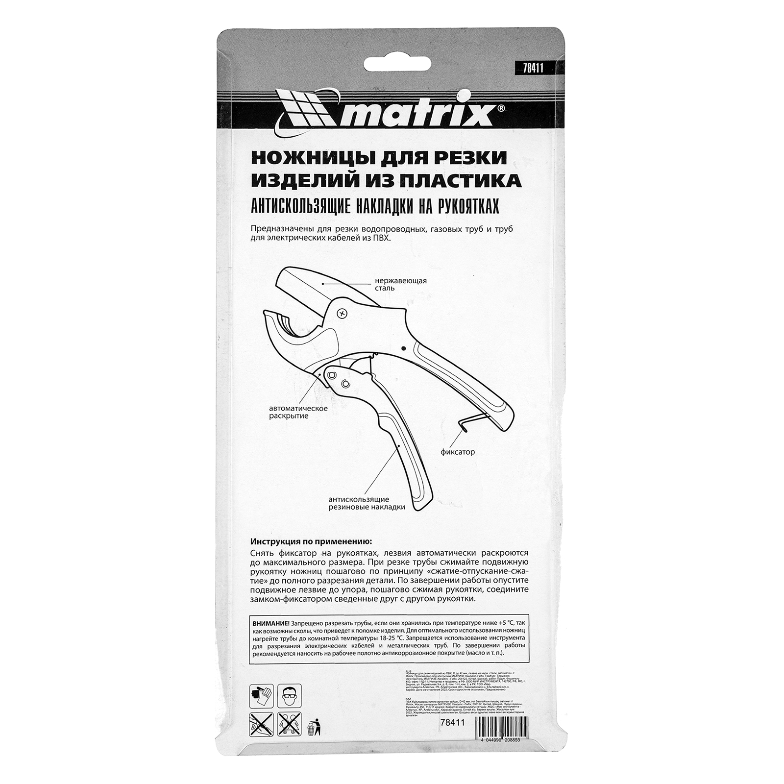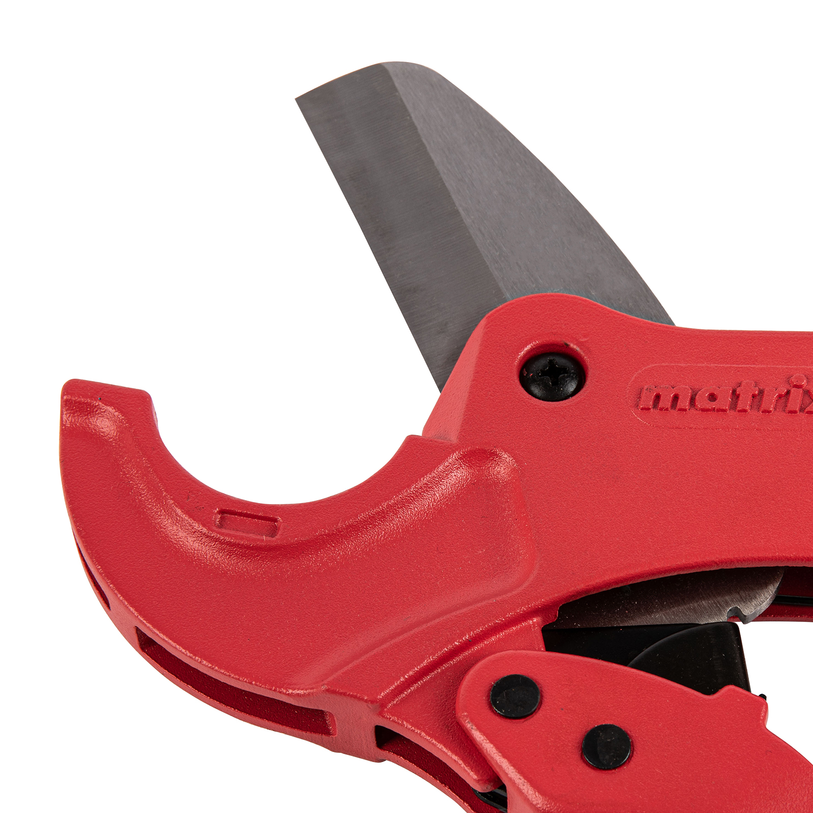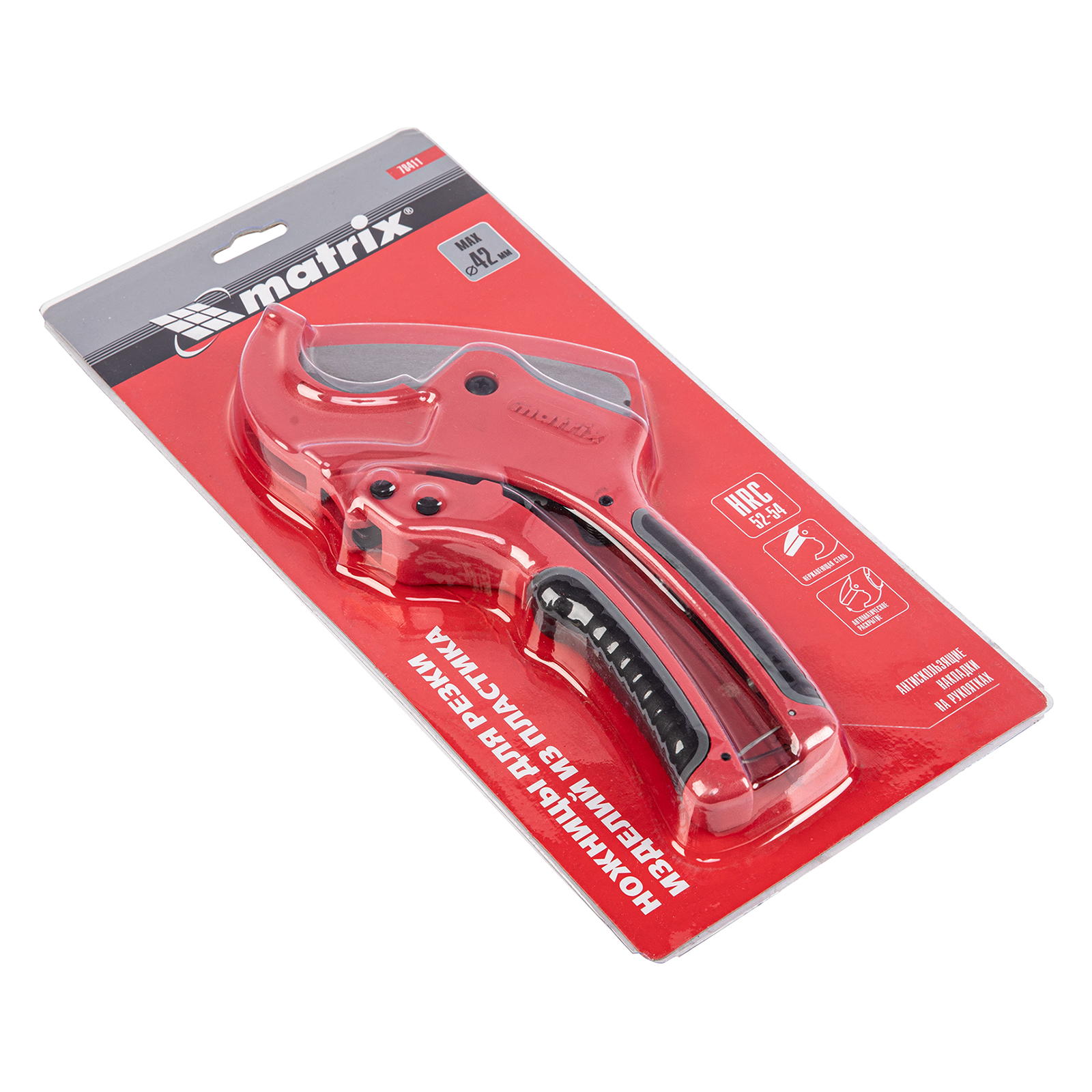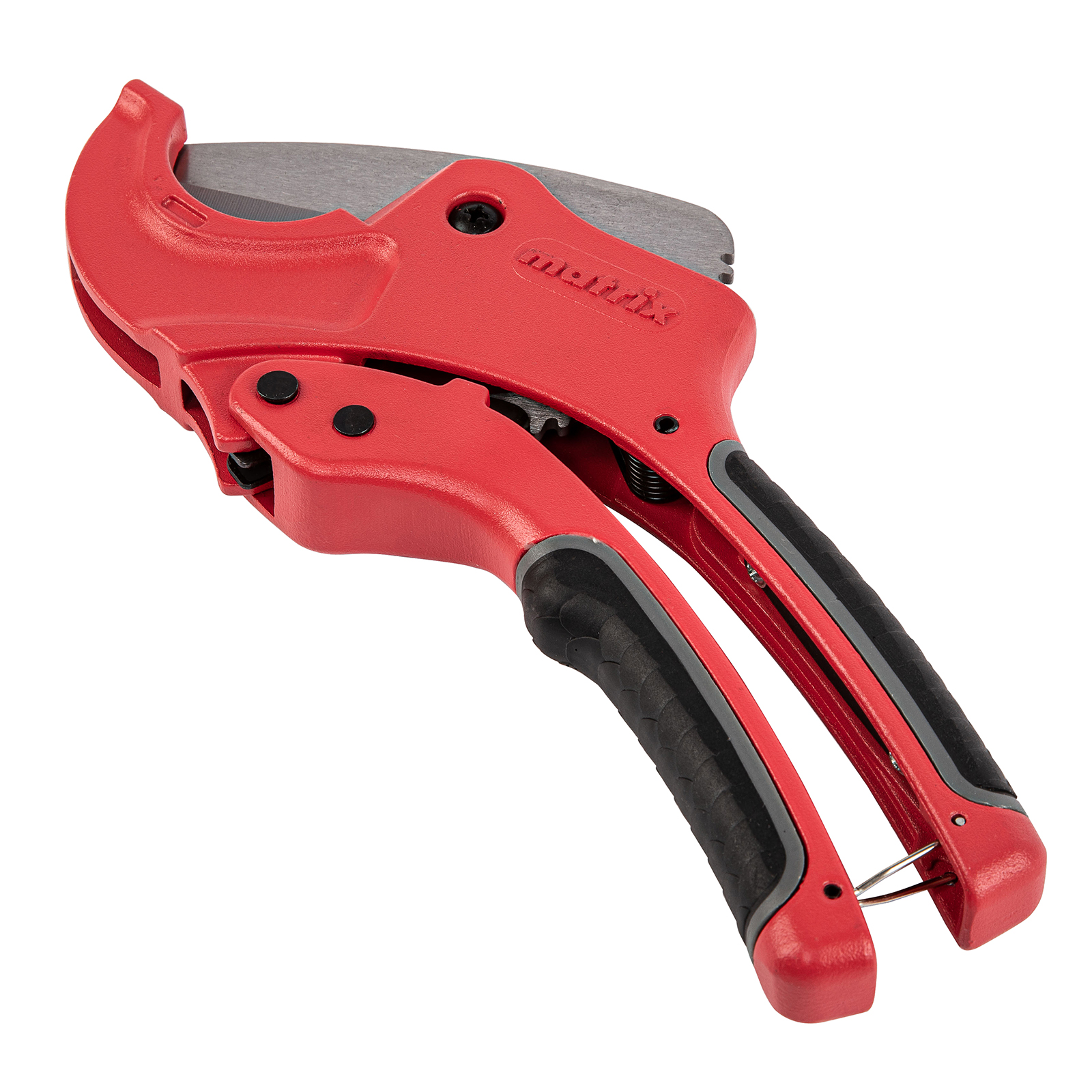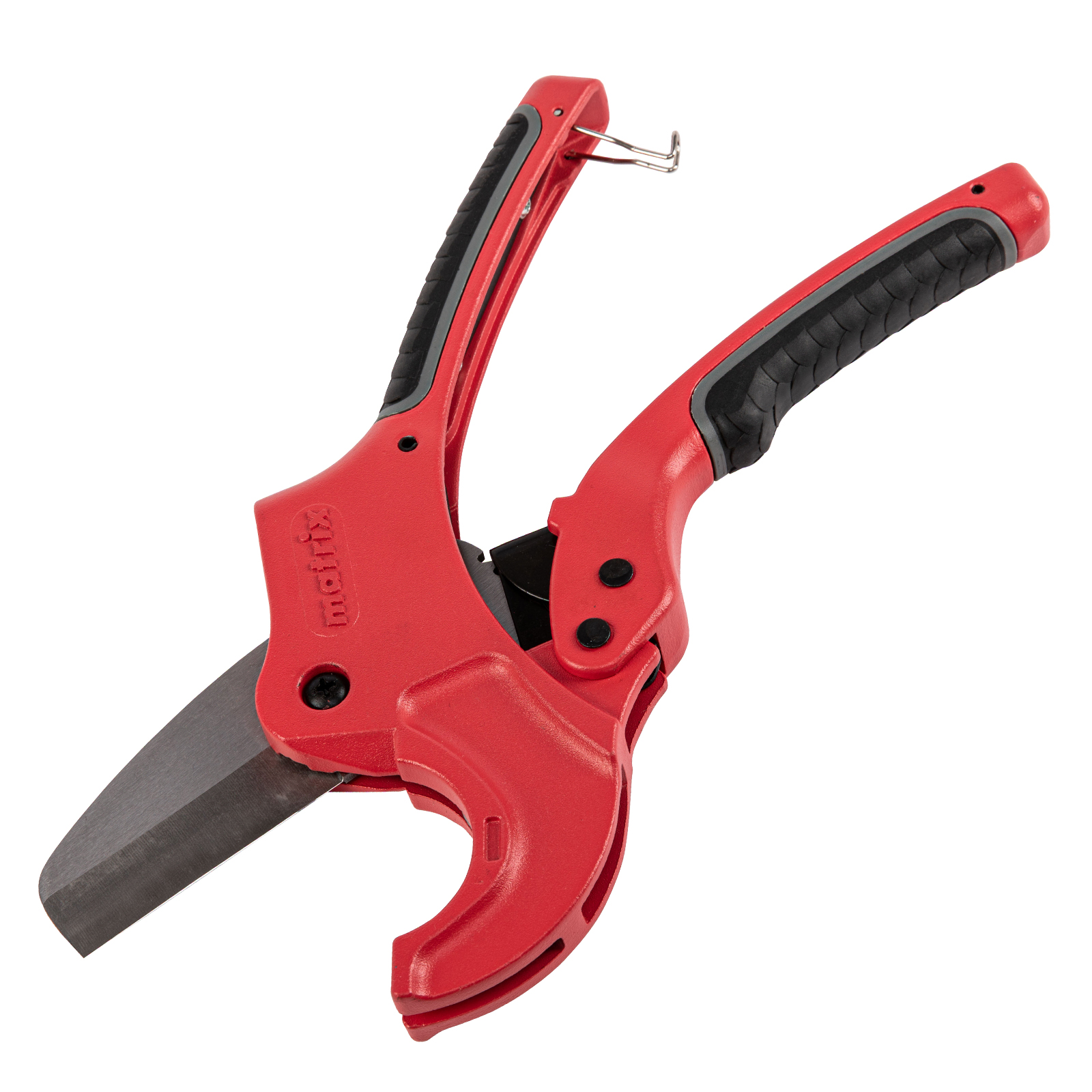 Ножницы для резки изделий из ПВХ Matrix 78411 с лезвием из нержавеющей стали и функцией автоматического раскрытия применяются для работы с пластиковыми трубами диаметром до 42 мм, а также для разрезания профилей, плинтусов, галтелей, реек, планок, резиновых шлангов и других предметов. Прямой нож инструмента позволяет резать плоские заготовки. Ножницы пригодятся для выполнения сантехнических и отделочных работ., , Преимущества, Прочность и долговечность — режущее полотно изготовлено из нержавеющей стали 3CR13., Защита от коррозии — на корпус нанесено порошковое покрытие., Высокая эффективность — механизм автоматического раскрытия позволяет выполнять работу быстрее, не прикладывая больших усилий., Комфортная работа без ощущения усталости — храповой механизм минимизирует прикладываемые усилия., Безопасное хранение и транспортировка — рукоятки можно заблокировать в сведенном положении., , Для корректной работы инструмента, чтобы предотвратить перекос лезвия относительно ПВХ-трубы, рекомендуется, чтобы отрезаемая часть была больше или равна внешнему диаметру ПВХ-трубы. В противном случае может возникнуть перекос лезвия, что также может привести к поломке лезвия/инструмента.