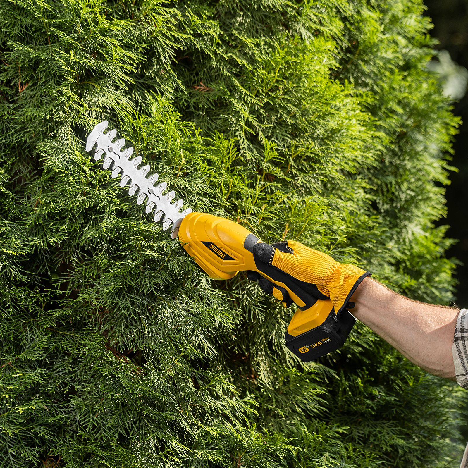 Ножницы-кусторез не зависят от сети электропитания, а значит, использовать их можно в отдаленных участках сада. Инструмент совместим с любым Li-Ion аккумулятором единой платформы Denzel Battery System 18V.