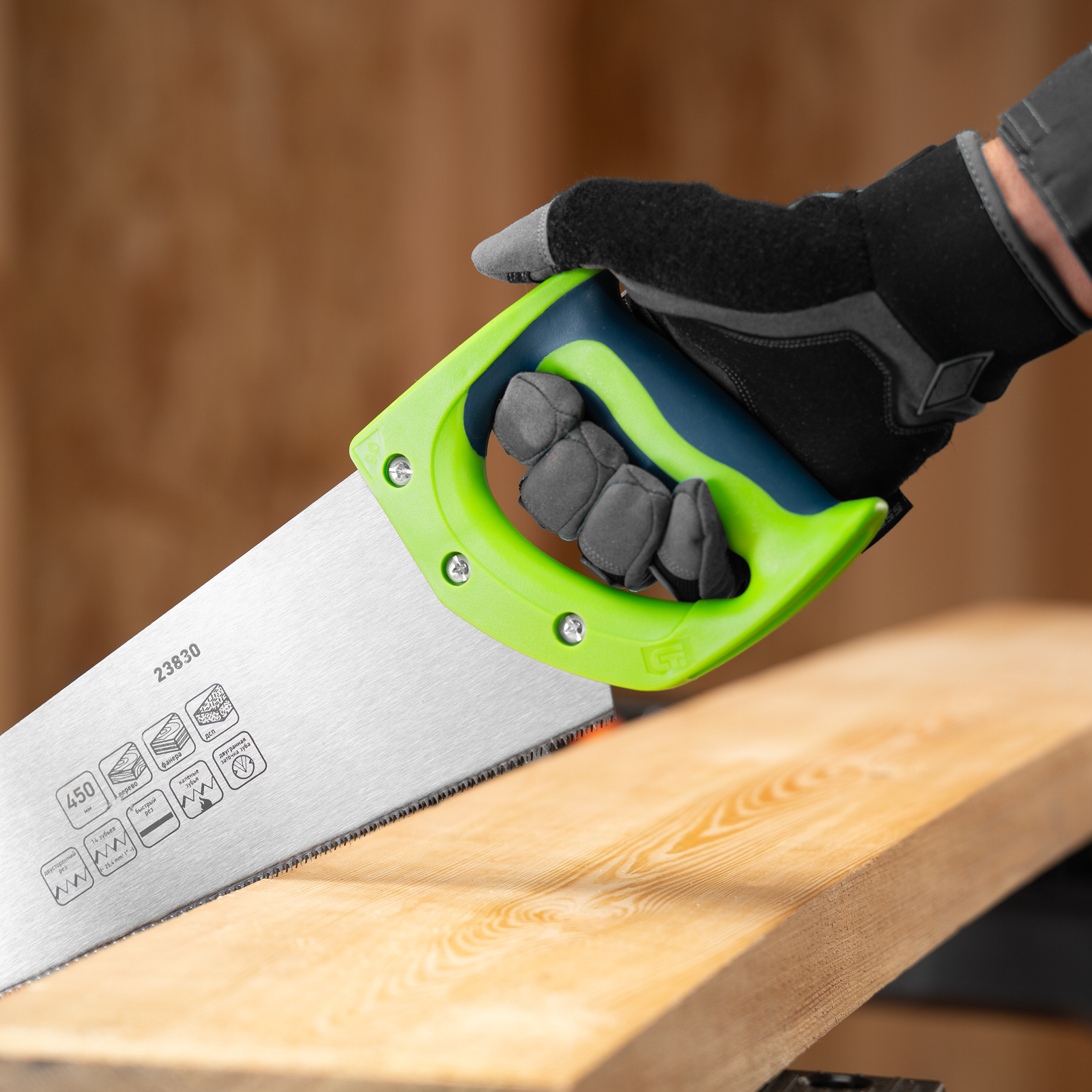 - Комфорт во время работы — рукоятка обрезинена, поэтому не скользит в ладони и снижает нагрузку на кисть руки во время длительного пиления.