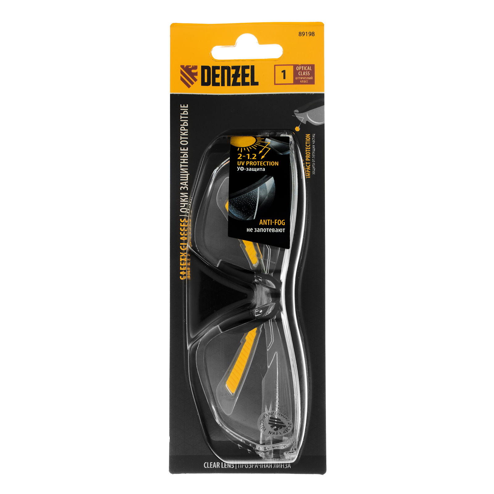 Очки защитные открытые Denzel 89198 с поликарбонатными прозрачными линзами предназначены для защиты глаз от механических повреждений и УФ-излучения. Очкам присвоен класс механической прочности F, они обеспечивают защиту от высокоскоростных частиц с низкоэнергетическим ударом (скорость частиц до 45 м/с). Легкие универсальные очки используются во время работы с электро- и бензоинструментом, на производстве и в быту.