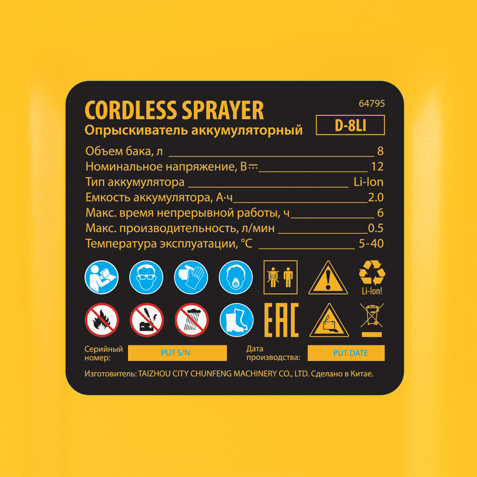 Опрыскиватель аккумуляторный D-8LI, 8 л, 12 В, 2 Ач Denzel