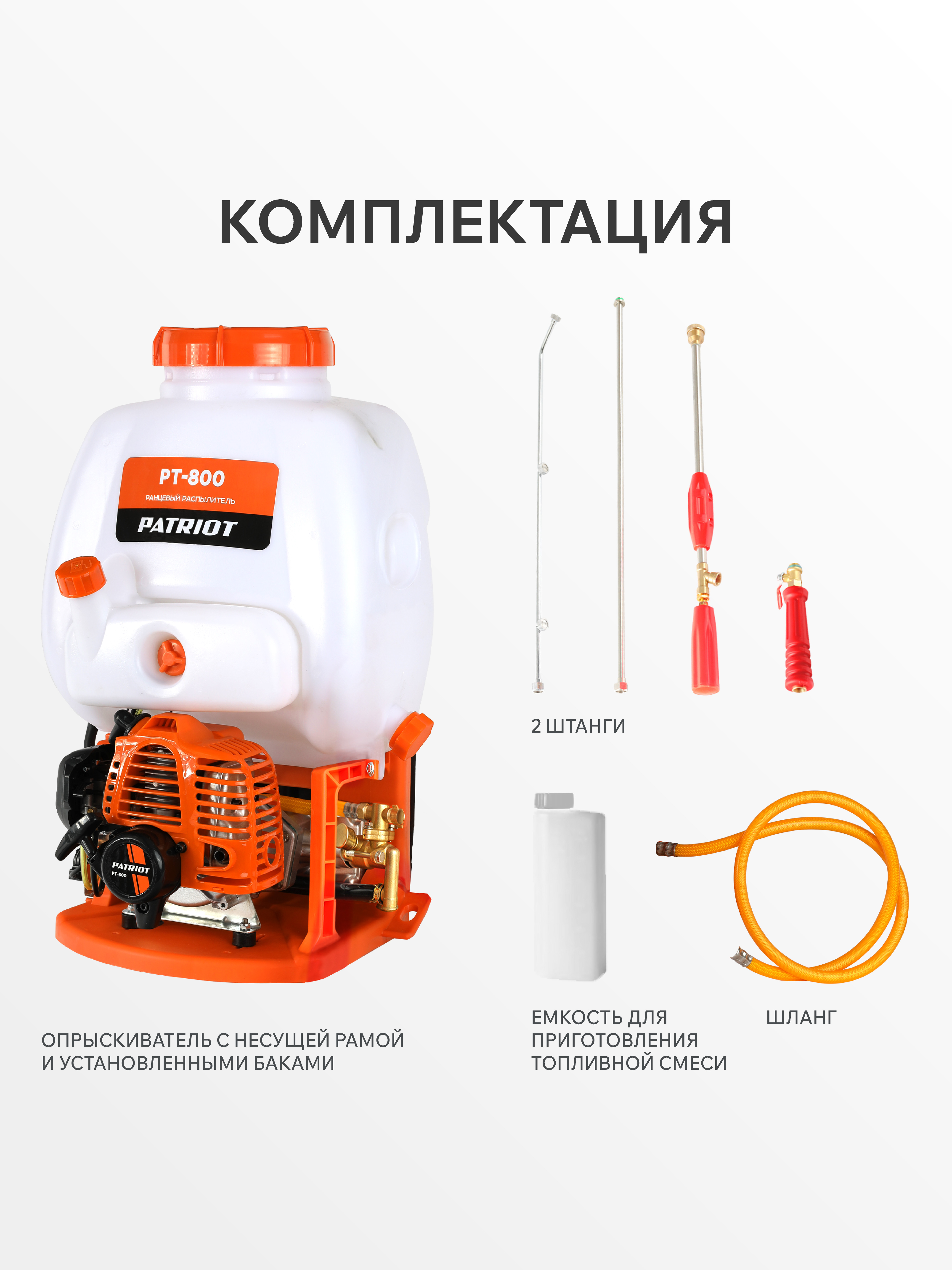 Опрыскиватель бензиновый; Штанга 2 шт.; Ранцевые ремни; Инструкция по эксплуатации; Ёмкость для приготовления топливной смеси |