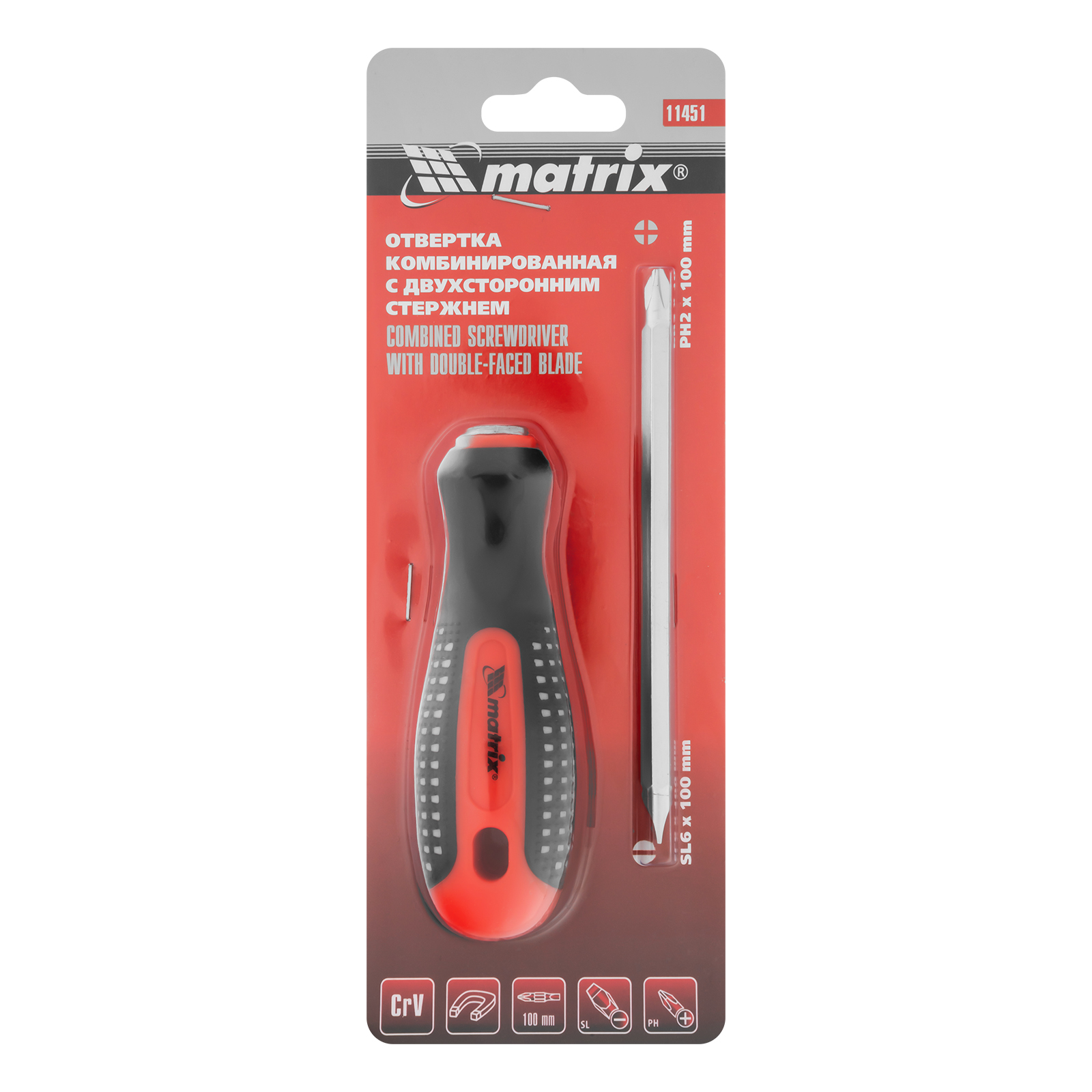 Комбинированная отвертка Matrix Fusion 11451, SL6,0 / PH2 мм, CrV, с 3-х компонентной рукояткой «anti slip», будет полезна профессиональным мастерам при проведении строительных и монтажных работ. Благодаря двустороннему стержню она позволяет проводить монтаж/демонтаж крепежа со шлицами Phillips и Slotted. Отвертка со стержнем 125 мм позволяет работать с крепежом в углублениях.