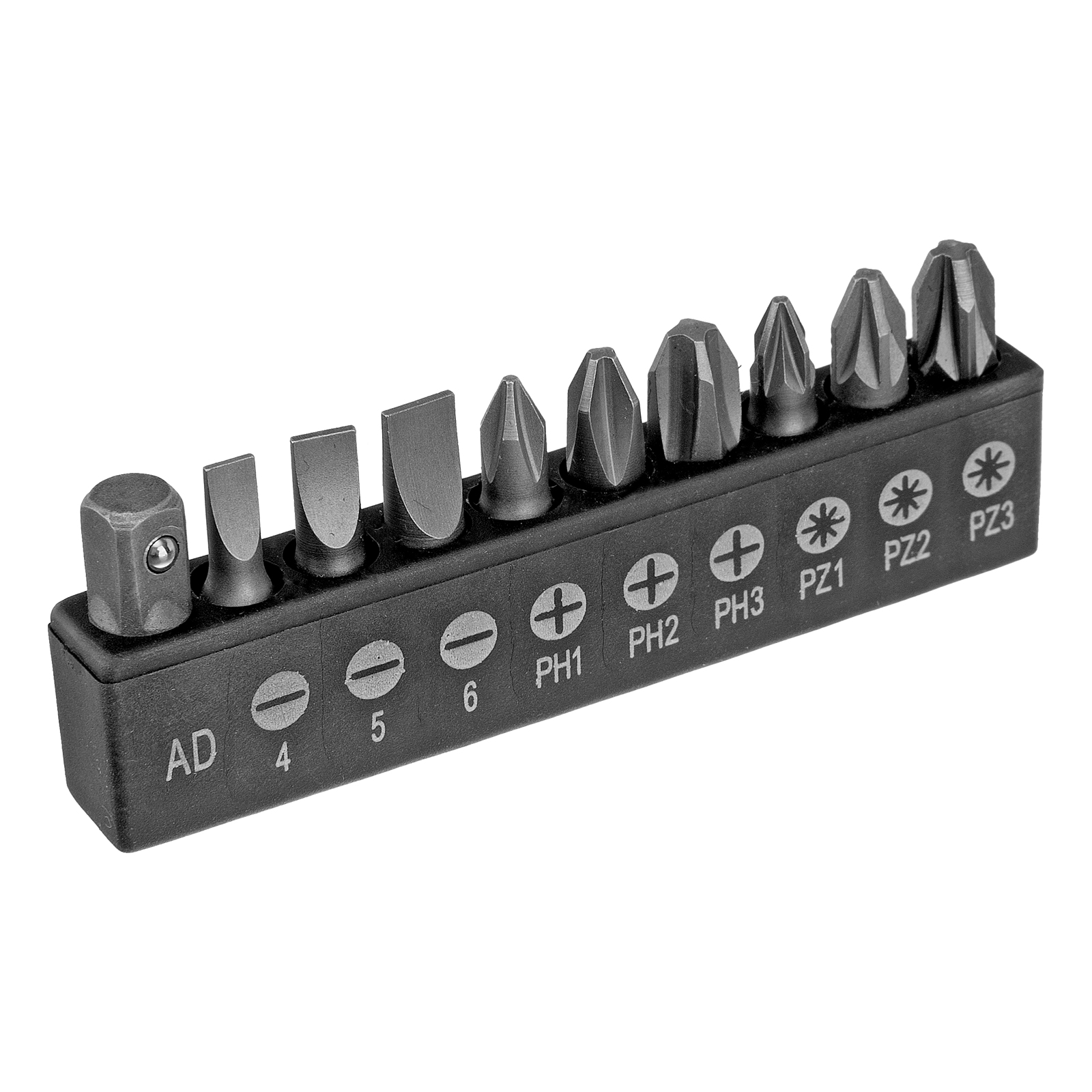 Отвертка реверсивная - 1 штБиты 25 мм: РН1, РН2, РН3, PZ1, PZ2, PZ3, SL4, SL5, SL6 мм - 9 штАдаптер для торцевых головок 1/4" - 1 штТорцевые головки 1/4": 5, 6, 10, 11 мм - 4 шт |