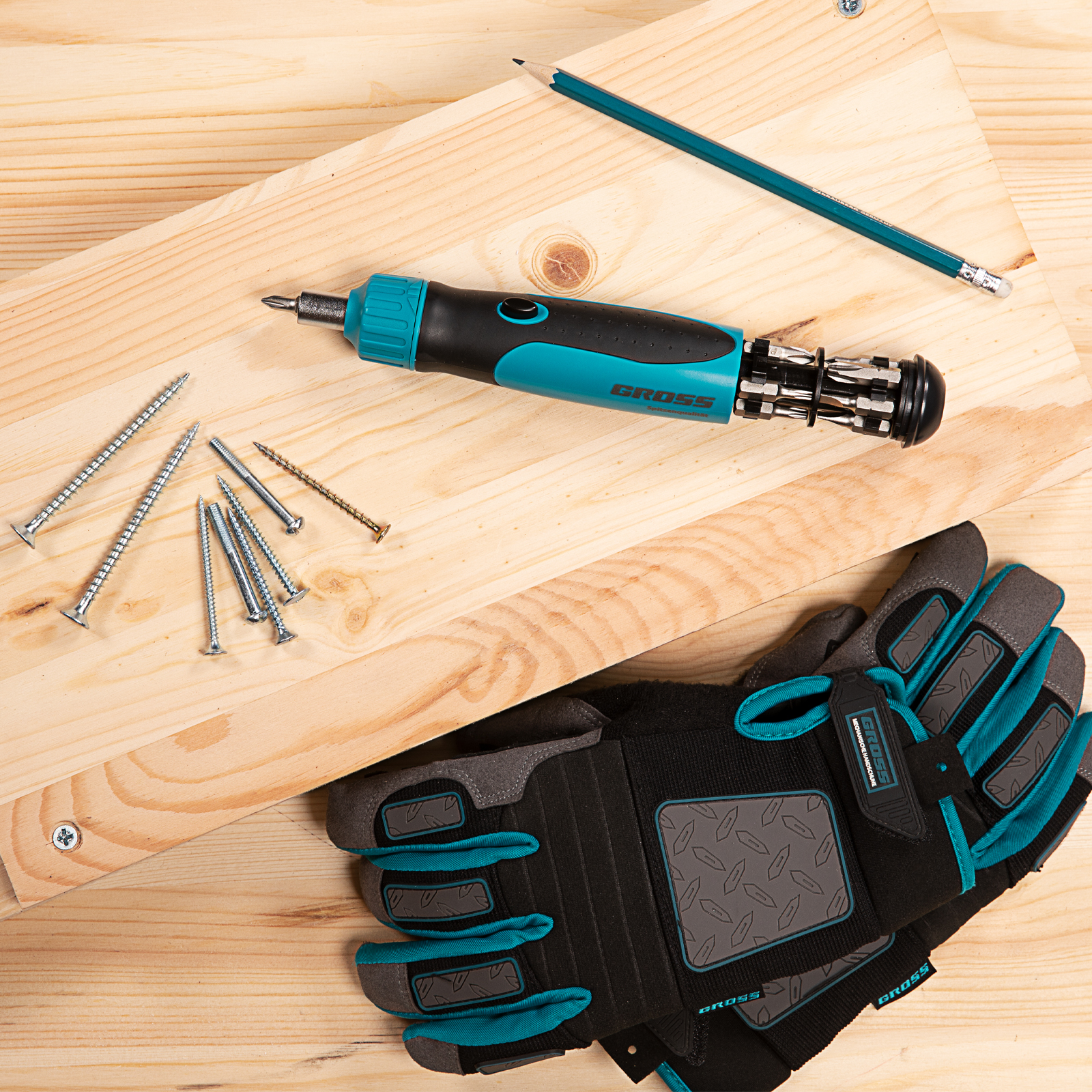 Реверсивная отвертка Gross 11611 с механизмом Smart Push комплектуется 12 битами из стали S2 с хвостовиком 1/4 дюйма для работы с крепежом типа PH, SL и TORX. За счет реверсивного механизма повышается скорость проведения работ. Отвертка универсальна, т.к. с ней можно использовать любые биты длиной 25 мм с хвостовиком 1/4 дюйма. Она будет полезна не только частным мастерам, но и профессионалам.