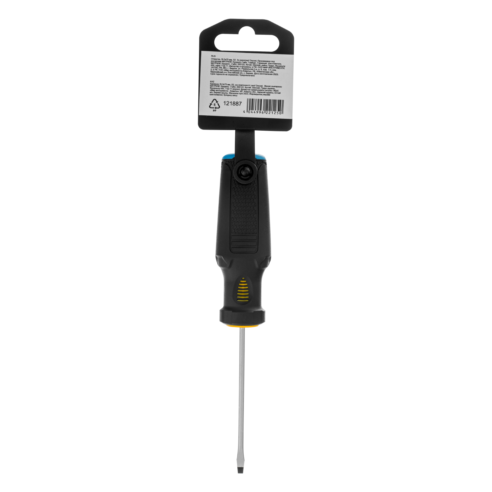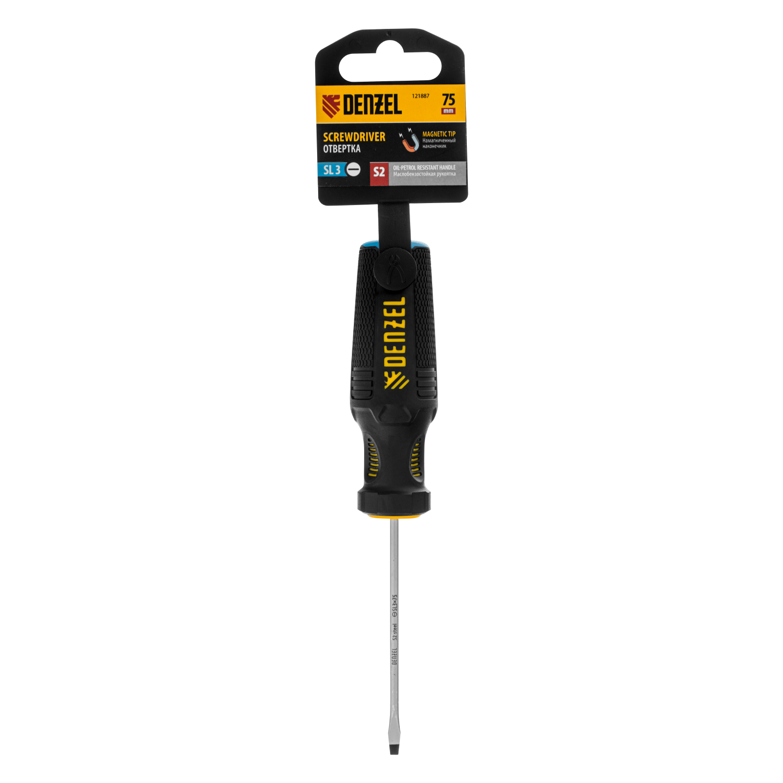 Отвертка Denzel 121887 с трехкомпонентной рукояткой, со стержнем из стали S2, длиной 75 мм, предназначена для монтажа и демонтажа винтов и саморезов с прямым шлицем SL3. Высокоточный намагниченный шлиц крепко фиксируется в головке крепежа. Отвертка выдерживает интенсивное применение, предназначена для выполнения профессиональных ремонтных и монтажных работ.