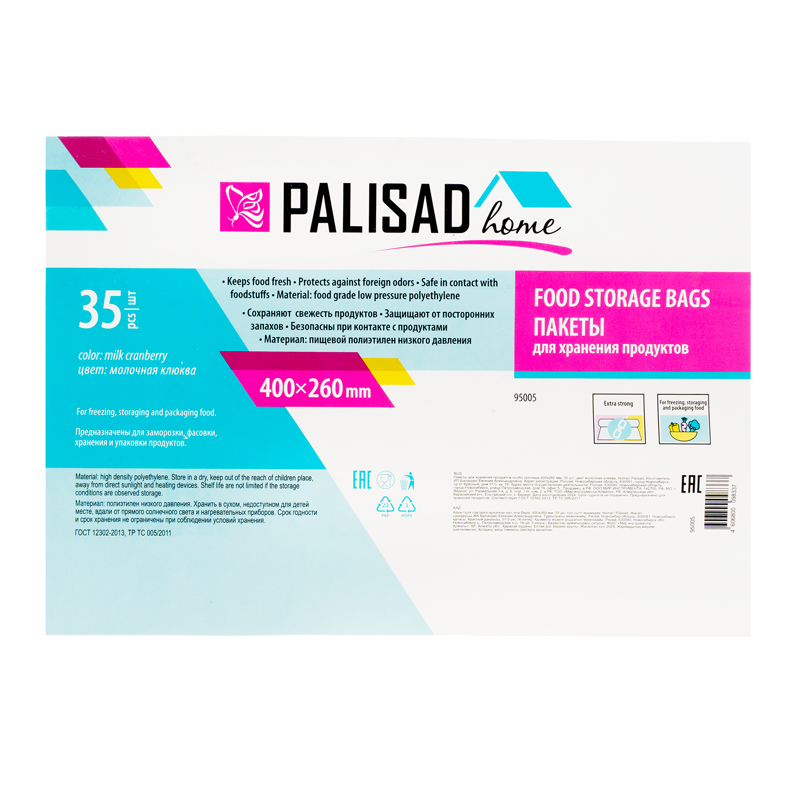Пакеты для хранения продуктов особо прочные,400x260 мм, 35 шт, цвет молочная клюква, Home Palisad
