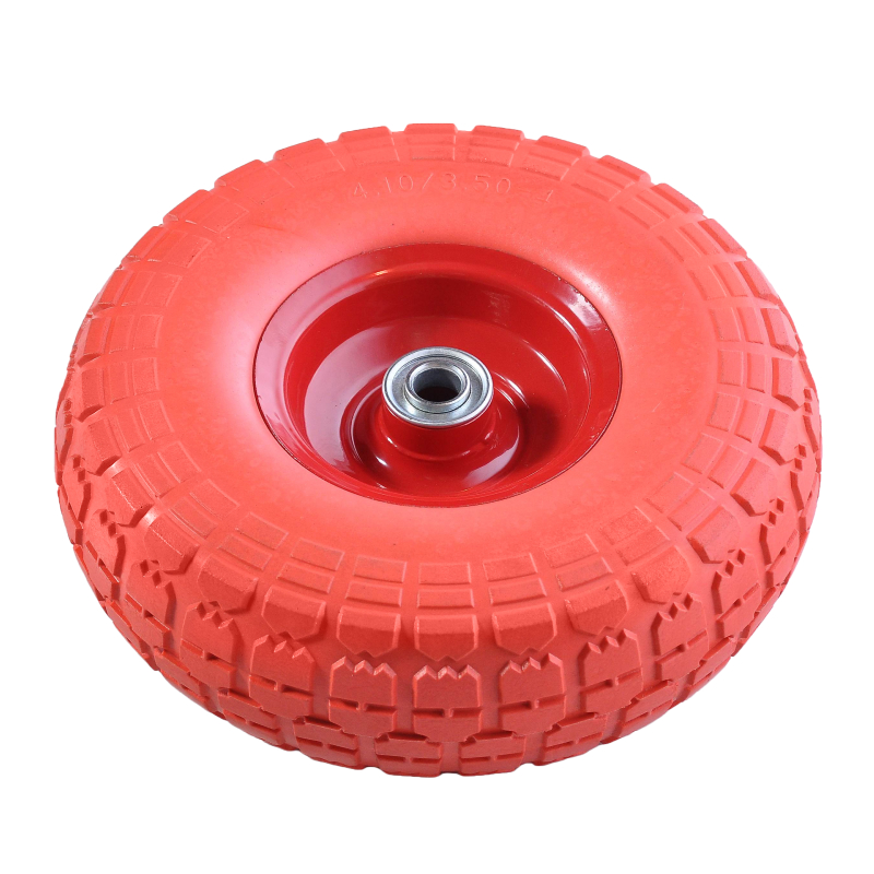 Грузоподъемность данного пенополиуретанового колеса составляет 150 кг, диаметр — 260 мм. Модель не требует подкачки и дополнительного обслуживания, не подвержена расслоению, не оставляет следов. Подходит для строительных и садовых тачек.