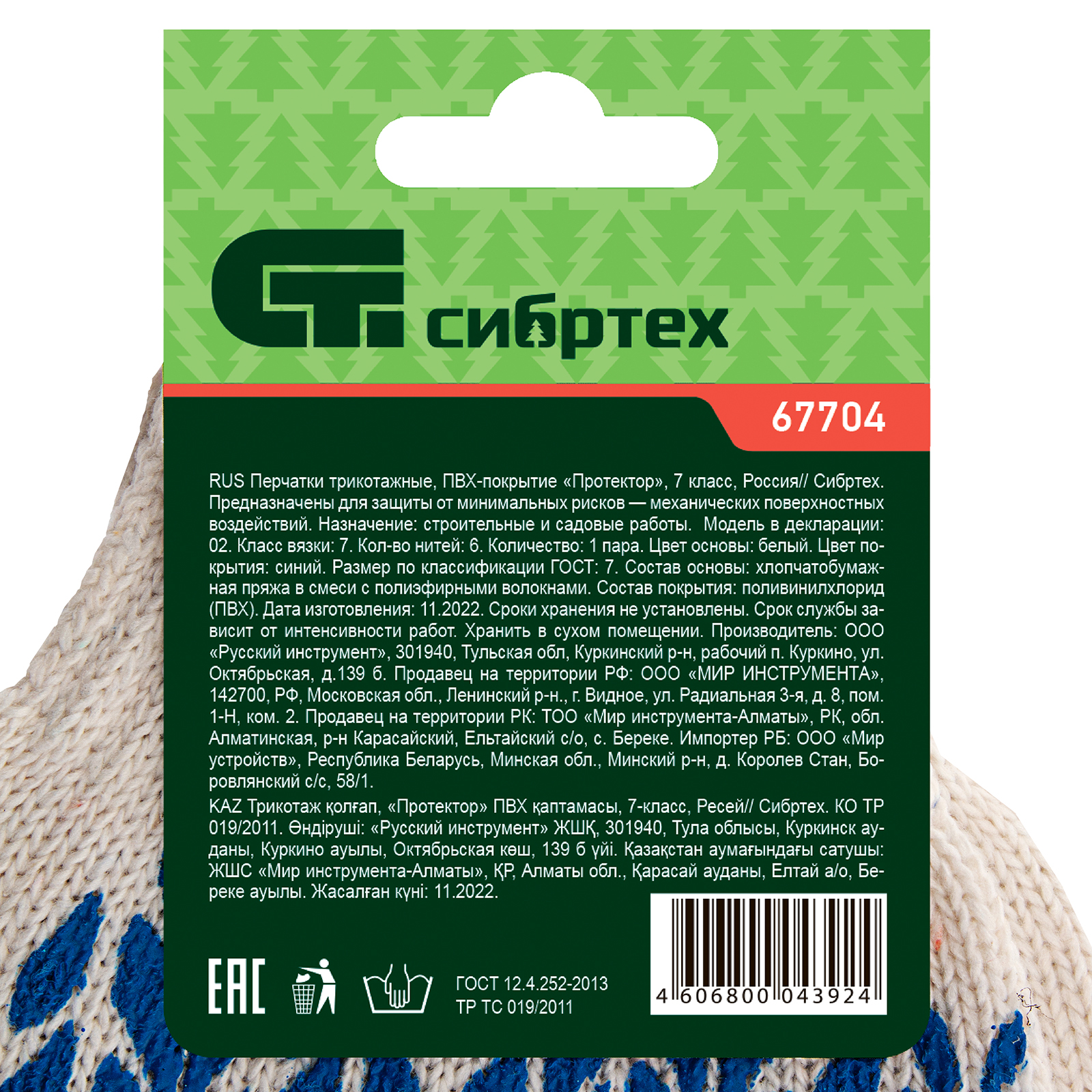 Перчатки х/б, ПВХ покрытие, "Протектор" 7 класс Сибртех