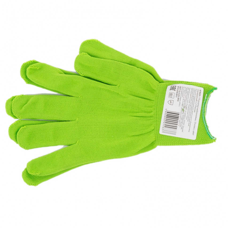 Перчатки 67823 изумрудного цвета, из нейлона, 13 класса вязки, размера L, надежно защищают руки от мозолей, ссадин, царапин и порезов. Тонкая ткань обеспечивает высокую тактильную чувствительность пальцев, поэтому перчатки подходят для работы с мелкими предметами. Будут полезны во время строительства, ремонта, сборочных работ, пригодятся также в быту.